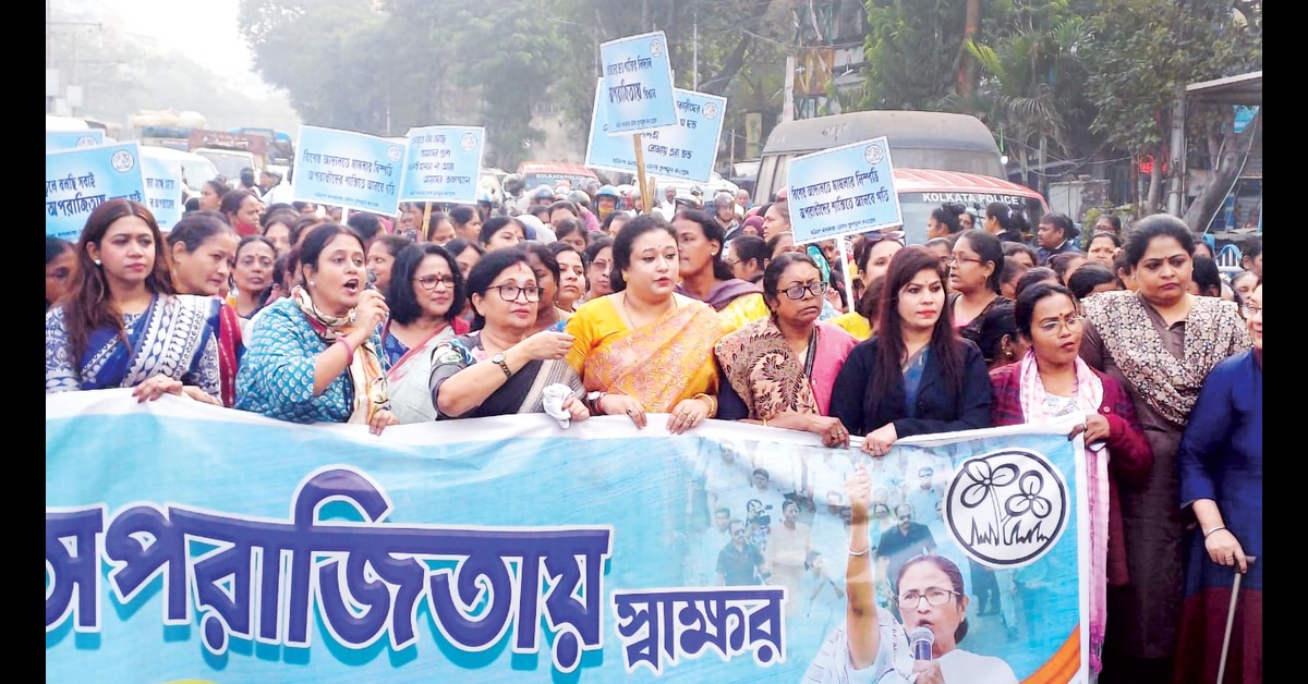 প্রতিবেদন : চারমাসেও অপরাজিতা বিলে (Aparajita Bill) অনুমোদন দিল না কেন্দ্র। এর প্রতিবাদে পথে নামল মহিলা তৃণমূল কংগ্রেস। শনিবার উত্তর কলকাতায় রাজ্যের মন্ত্রী ডাঃ শশী পাঁজার নেতৃত্বে প্রতিবাদ মিছিল করলেন তাঁরা। রামলীলা ময়দান থেকে শুরু হয়ে মিছিল গিয়ে শেষ হয় সিআইটি রোডের লেডিজ পার্কে। মিছিলে নেতৃত্ব দেন মন্ত্রী ডাঃ শশী পাঁজা, কাউন্সিলর মীনাক্ষী গঙ্গোপাধ্যায়, তৃণমূলনেত্রী স্মিতা বক্সি-সহ অন্যরা। অপর মিছিলটিতে নেতৃত্ব দেন মহিলা তৃণমূলের সভানেত্রী মন্ত্রী চন্দ্রিমা ভট্টাচার্য। ছিলেন চৈতালি চট্টোপাধ্যায়, প্রিয়দর্শিনী হাকিম-সহ অন্যরা। মিছিল থেকে অপরাজিতা বিলে দ্রুত অনুমোদনের দাবি তোলেন তাঁরা।