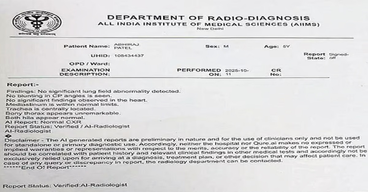 যদিও এইমস এর ডাক্তাররা বিষয়টিকে গুরুত্ব দিতে নারাজ। তাদের মতে এটি চূড়ান্ত নয়, প্রাথমিক রিপোর্ট। বিষয়টি পরীক্ষামূলক। শুক্রবার দিল্লির অল ইন্ডিয়া ইনস্টিটিউট অফ মেডিক্যাল সায়েন্সেস (এইমস)–এর রেডিয়োলজি বিভাগে এক রোগীর বুকের এক্সরে ঘিরে চাঞ্চল্য ছড়ায়। রিপোর্টের নীচে লেখা— ‘ভেরিফায়েড/এআই–রেডিয়োলজিস্ট’। বোঝা গেল পাঁচ বছরের এক শিশুর বুকের এক্সরে প্লেট বিশ্লেষণ করে কোনও রেডিয়োলজিস্ট রিপোর্টটি তৈরি করেননি, ‘অস্বাভাবিক কিছু নেই’ লিখে দিয়েছে কৃত্রিম বুদ্ধিমত্তা বা এআই। রিপোর্ট ভাইরাল হতেই দেশে রেডিয়োলজিস্টের বিশ্লেষণ ছাড়া এআই রোগনির্ণয় নিয়ে দ্বন্দ্ব শুরু হয়েছে। চিকিৎসক মহলেও এই নিয়ে তীব্র বিতর্ক তৈরি হয়।