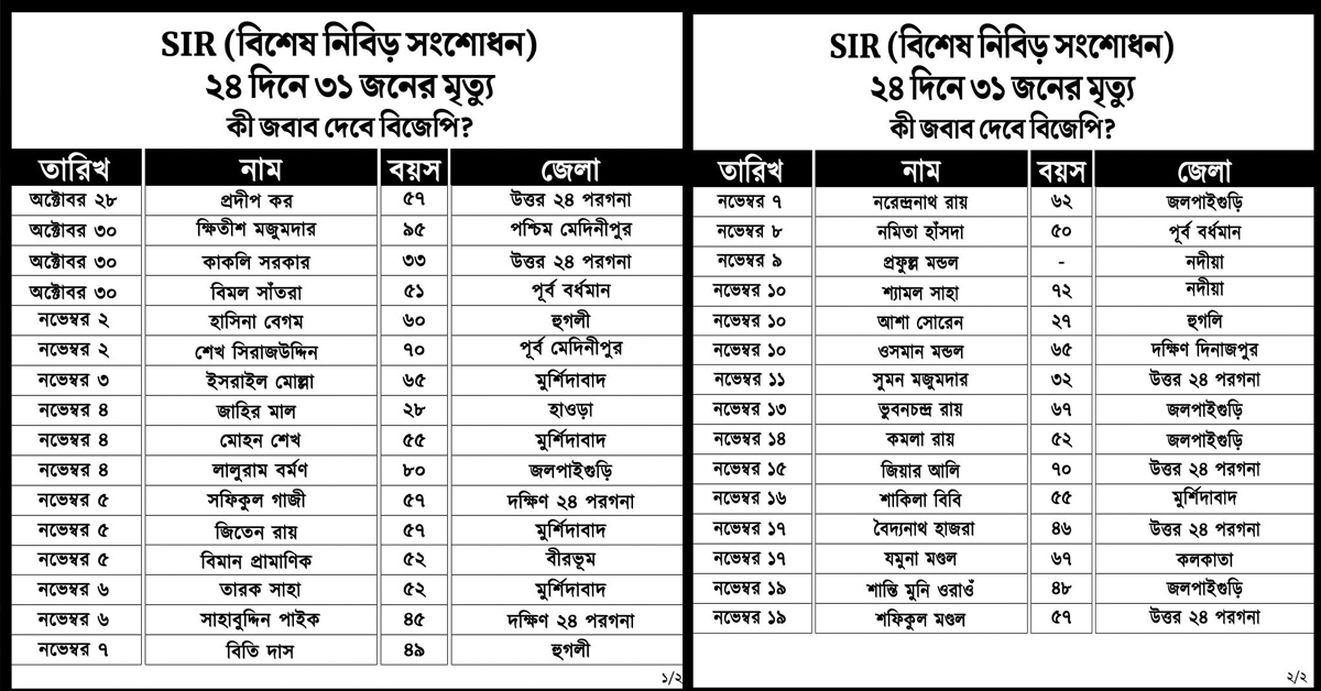 নয়াদিল্লি : বিধানসভা ভোটের মুখে বাংলায় এসআইআর (SIR) বা বিশেষ নিবিড় সংশোধনীর নামে কার্যত জুলুম চালাচ্ছে নির্বাচন কমিশন। বিজেপির অঙুলিহেলনে কমিশনের এই পদক্ষেপে নাজেহাল জনজীবন। গত ২৪ দিনে পশ্চিমবঙ্গে ৩১ জনের মৃত্যু হয়েছে। এই তালিকায় আতঙ্কিত সাধারণ মানুষের পাশাপাশি বিএলওরাও রয়েছেন। বিএলওদের যুক্তিসঙ্গত সমস্যার কথা না শুনেই তাঁদের উপর সিংহভাগ দায়িত্ব চাপিয়ে দিয়েছে নির্বাচন কমিশন। পাশাপাশি হুঁশিয়ারি দেওয়া হয়েছে শাস্তিমূলক পদক্ষেপের। নির্বাচন কমিশনের বেনজির চাপের মুখে একাধিক বিএলও অসুস্থ হয়েছেন, অনেকের মৃত্যুও হয়েছে। তা সত্ত্বেও নির্বিকার কমিশনের আধিকারিকরা। অন্যদিকে, বিজেপি নেতারা যেভাবে এসআইআরের (SIR) নামে হুমকি দিচ্ছেন, তাতেও বহু মানুষ অনিশ্চয়তার আতঙ্কে ভুগছেন। সব মিলিয়ে নির্বাচন কমিশনের এসআইআর কর্মসূচির পর থেকেই মৃত্যুমিছিল শুরু হয়েছে। জাতীয় নির্বাচন কমিশনের এই সিদ্ধান্তের পিছনে ‘রাজনৈতিক পরিকল্পনা’ রয়েছে বলে শুরু থেকেই অভিযোগ শানিয়েছে তৃণমূল কংগ্রেস। দলনেত্রী মমতা বন্দ্যোপাধ্যায় তোপ দেগেছেন বিজেপি-কমিশনের অশুভ আঁতাতের দিকে। এসআইআর প্রত্যাহারের আর্জিও জানিয়েছন তিনি। এই পরিস্থিতিতে সংসদের আসন্ন শীতকালীন অধিবেশনের নির্বাচন কমিশনের ভূমিকা নিয়ে আলোচনা চায় তৃণমূল কংগ্রেস। দলের রাজ্যসভার দলনেতা ডেরেক ও’ব্রায়েন বলেন, মানুষের ইস্যু নিয়ে সরকারের কাছে জবাবদিহি চাওয়ার জন্য সংসদের প্রতিনিধিরা দায়বদ্ধ। কিন্তু মোদি সরকার চায় সংসদ অচল হয়ে থাক। কারণ সংসদ অচল হলে মানুষের একাধিক জ্বলন্ত সমস্যা নিয়ে জবাব দেওয়ার দায় থাকে না সরকারের। নিজেদের বাঁচাতেই এবারও সংসদে নির্বাচন কমিশন ইস্যুতে কেন্দ্রীয় সরকার আলোচনার পক্ষপাতী নয়। ডেরেক জানান, সংসদীয় আইনের ১৬৯ ধারায় জনস্বার্থ সংশ্লিষ্ট বিষয় নিয়ে আইনসভায় আলোচনা সম্ভব। অতীতেও নির্বাচন কমিশনের এক্তিয়ারভূক্ত একাধিক বিষয় নিয়ে সংসদে আলোচনা হয়েছে। এবারে তাহলে অনীহা কেন সরকারের?