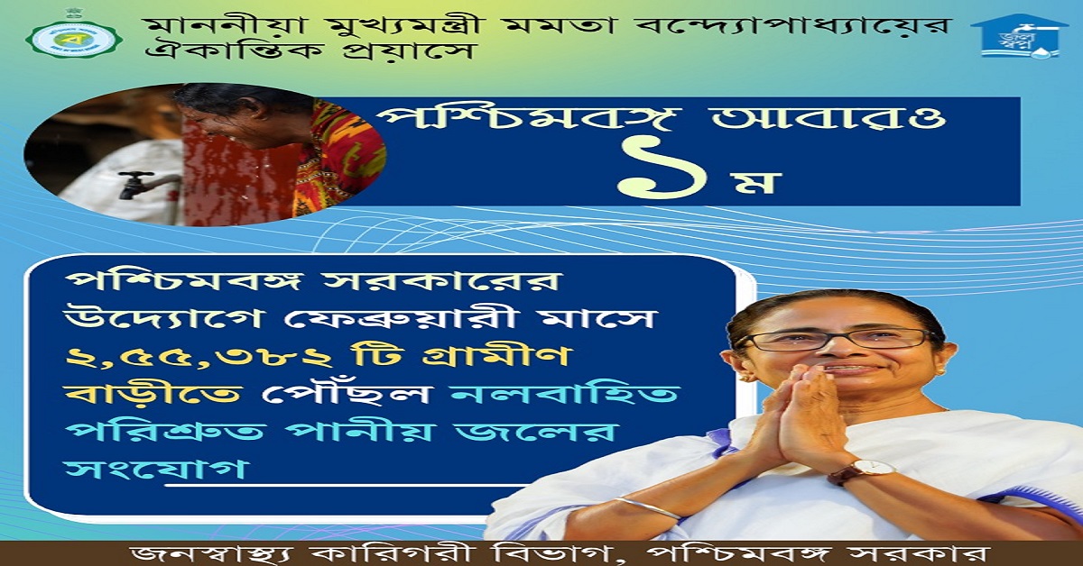 নভেম্বর থেকে প্রতি মাসেই দেশের শীর্ষে রাজ্য। জানুয়ারিতে ২ লাখ ৪৬ হাজার ৫৪৪টি বাড়িতে জলের সংযোগ দিয়ে দেশের সেরা হয়েছিল বাংলা। ফেব্রুয়ারিতে লক্ষ্যমাত্রা ছিল ২ লাখ ৬০ হাজার ৫৫২টি বাড়ি, তার ৯৮.০২% পূরণ হয়েছে। ১৪টি জেলা লক্ষ্যমাত্রা পূরণ করেছে। জনস্বাস্থ্য কারিগরি মন্ত্রী পুলক রায় বলেন ‘চার মাস দেশের শীর্ষে থাকলেও আত্মতুষ্ট হলে চলবে না। যেসব জেলায় লক্ষ্য পূরণ হয়নি সেখানে বিশেষ নজর দিচ্ছি। মার্চেই লক্ষ্য পূরণ করতে হবে।’