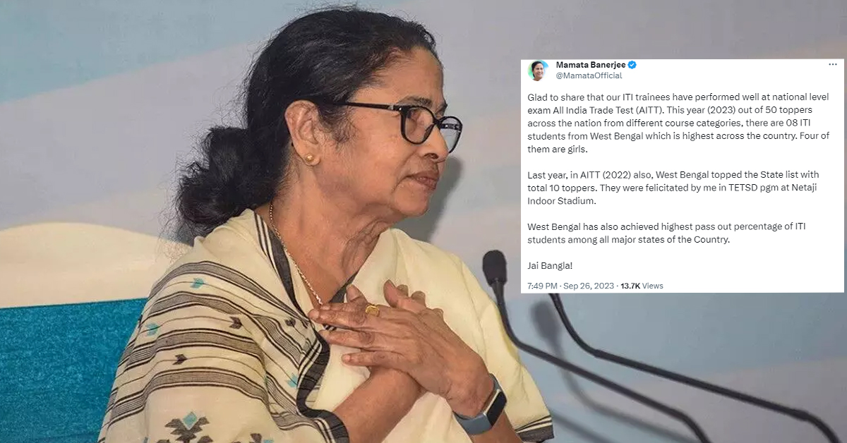 এক্সে মমতা বন্দ্যোপাধ্যায় জানিয়েছেন, “ITI প্রশিক্ষণপ্রাপ্ততরা জাতীয় স্তরের পরীক্ষা অল ইন্ডিয়া ট্রেড টেস্টে (All India Trade Test) ভালো পারফর্ম করেছে এটা জানাতে পেরে আনন্দিত। চলতি বছর বিভিন্ন কোর্সের বিভাগ থেকে সারা দেশে ৫০ জন টপারের মধ্যে পশ্চিমবঙ্গের ৮জন ITI ছাত্র রয়েছে যা সারা দেশে সর্বোচ্চ। তাদের মধ্যে চারজন মেয়ে।“ তিনি আরও জানান,”গত বছর, AITT-তে টপারদের মধ্যে পশ্চিমবঙ্গের ১০ জন ছিলেন। নেতাজি ইন্ডোর স্টেডিয়ামে TETSD প্রোগ্রামে সংবর্ধনা দেওয়া হয়েছিল।“ একইসঙ্গে তিনি জানিয়েছেন, “দেশের সমস্ত প্রধান রাজ্যগুলির মধ্যে পশ্চিমবঙ্গ আইটিআই ছাত্রদের সর্বোচ্চ পাশ আউট শতাংশও অর্জন করেছে।“