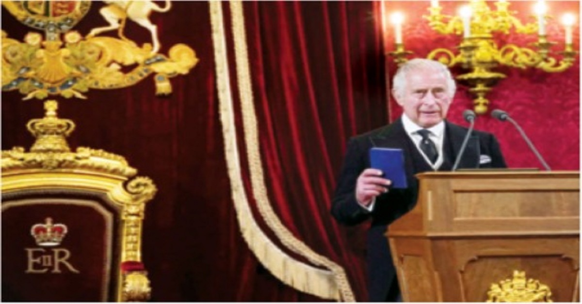 শনিবার সেন্ট জেমস প্যালেসে আর্চবিশপ জাস্টিন ওয়েলবি, প্রিন্স উইলিয়াম ও পিভি কাউন্সিলের সদস্যগণ ও নতুন প্রধানমন্ত্রীর উপস্থিতিতে সমস্ত রীতিনীতি মেনে ব্রিটেনের রাজার দায়িত্ব নিলেন তৃতীয় চার্লস। লন্ডনের সেন্ট জেমস প্যালেসে সাদা-কালো পোশাক সজ্জিত হয়ে আসেন চার্লস। টেবিলে রাখা ছিল সদ্য প্রয়াত রানির ছবি। মায়ের আদর্শকে পাথেয় করে পথচলা শুরু করার কথা জানালেন ব্রিটেনের নতুন রাজা।