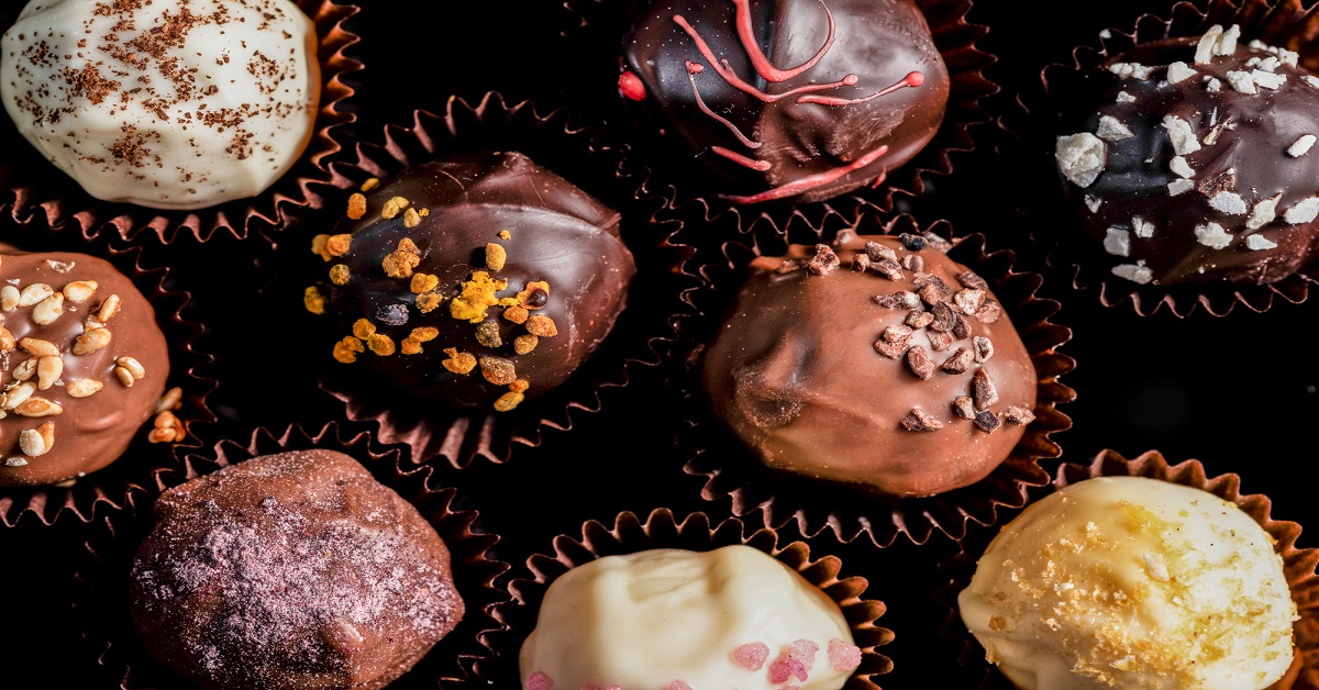 Chocolate Pralines Decorated by Hand. Close Up View on Details.