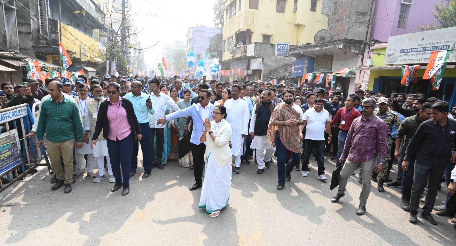 বুধবার সকাল ১১:৩৫ মিনিটে মালদহের পুলিশ লাইন হেলিপ্যাড পৌঁছানো মাত্রই উচ্ছ্বাসে ভাসলেন সাধারণ মানুষ। কপ্টারে মুখ্যমন্ত্রীর সঙ্গে ছিলেন মন্ত্রী অরূপ বিশ্বাস আর হেলিপ্যাড গ্রাউন্ডে আগে থেকে উপস্থিত ছিলেন দুই মন্ত্রী ফিরহাদ হাকিম ও বাবুল সুপ্রিয় এবং স্বরাষ্ট্র সচিব। শুরু হয় মমতা বন্দ্যোপাধ্যায়ের পদযাত্রা। গতিপথ ছিল মাত্র এক কিলোমিটারের, কিন্তু মানুষের ভালোবাসায় বারবার নিজের গতি শ্লথ করলেন মানবিক মুখ্যমন্ত্রী। আর কে মিশন রোডে এক অসুস্থ বৃদ্ধাকে হাসপাতালে পাঠানোর ব্যবস্থা করলেন। কখনও মহিলাদের সঙ্গে হাত মিলিয়েছেন কখনও আবার বৃদ্ধার অভিযোগ শুনে কৃষ্ণেন্দু নারায়ণ চৌধুরীকে নির্দেশ দিলেন সমস্যা মেটানোর জন্য। চলার পথে অভিরামপুরে কালীমন্দিরে পুজো দিলেন, স্বামী বিবেকানন্দের মূর্তিতে শ্রদ্ধা জানালেন বাংলার ‘দিদি’।