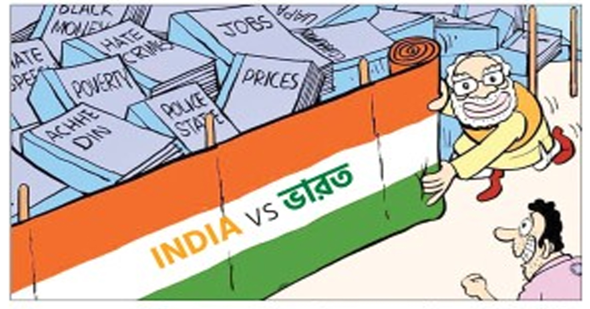 এ এক অভূতপূর্ব পরিস্থিতি। একদিকে বেসামাল অর্থনীতি, চূড়ান্ত বেকারত্ব, চরম আর্থিক বৈষম্য। অন্যদিকে দেশের বিভিন্ন প্রান্তে, ঘটে চলা বিভিন্ন জাতি-দাঙ্গা। তার মধ্যে বিরোধীরা জোটবদ্ধ। ২৬টি বিরোধী দল মিলে চ্যালেঞ্জ ছুঁড়ে দিচ্ছে প্রতিদিন। লোকসভা নির্বাচন যদি সঠিক সময়ে হয় তাহলে বড়জোর আর মাস সাতেক হাতে সময় আছে। দিল্লির শাসকের কাছে সবথেকে চিন্তার যেটা সেটা হল, বিরোধী জোটের নাম ‘I.N.D.I.A’. যে নাম দেশের প্রতিটি প্রান্তে মানুষের মুখে মুখে ঘুরছে। I.N.D.I.A জোটের (INDIA Alliance) একেকটা মিটিং হচ্ছে আর প্রবল ক্ষমতাধর প্রধানমন্ত্রীর কপালে বিন্দু বিন্দু ঘামের পরিমাণ বেড়ে চলেছে। অতএব চালাও কাঁচি! দেশের নামই বদলে ফেল! এত বছর ধরে ‘ইন্ডিয়া’ এবং ‘ভারত’ দুটি নামই তো দিব্যি ছিল। হঠাৎ এত গাত্রদাহের কারণ কী, সেটা বুঝতে নিশ্চয়ই কাউকে রাজনৈতিক পণ্ডিত হতে হয় না। যদিও বিজেপি নেতারা যুক্তি দিচ্ছেন, ঔপনিবেশিক মানসিকতা থেকে বেড়িয়ে আসতেই এই প্রয়াস।