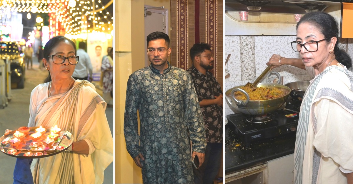 প্রতি বছরই কালীপুজোর সন্ধেয় বাড়ির সর্বত্র প্রদীপ জ্বালান মুখ্যমন্ত্রী। এবারও থালায় প্রদীপ সাজিয়ে বিভিন্ন কোণায় সেই দীপ প্রজ্জ্বলন করেন। রাঁধেন ঠাকুরের ভোগ। বড় কড়াইয়ে অনায়াস ভঙ্গীতে চালান খুন্তি।