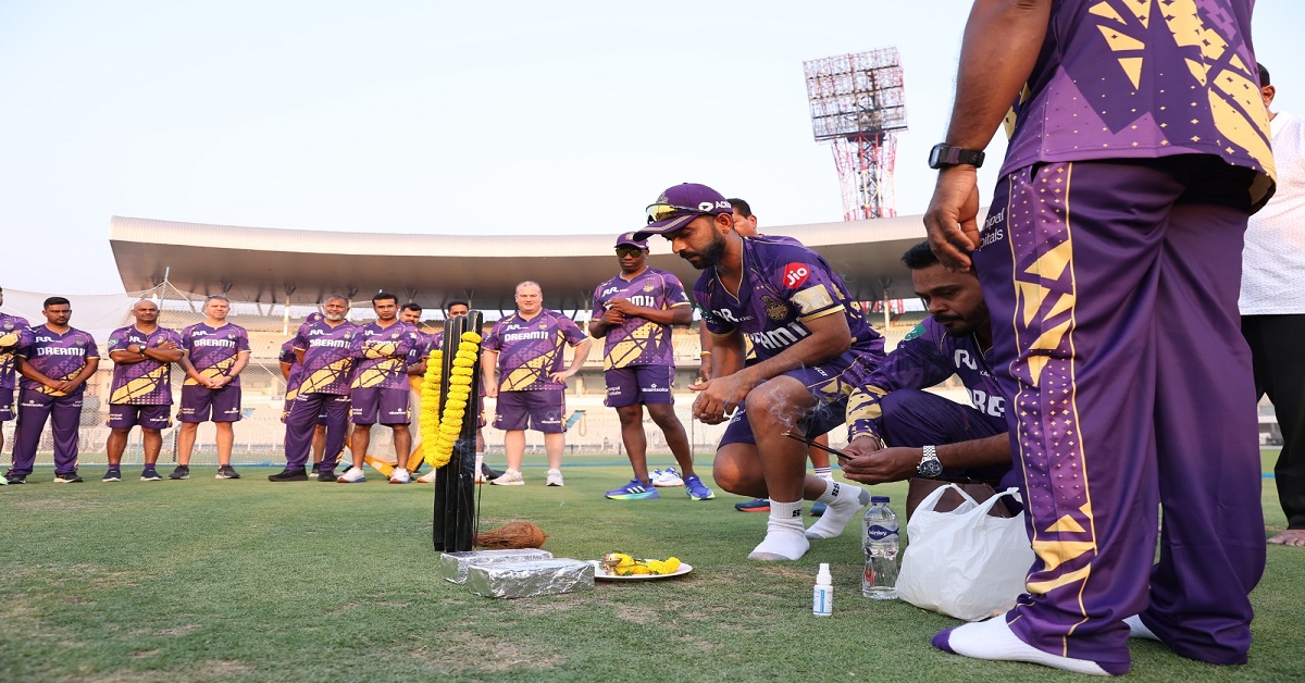 প্রথম দিন উইকেটে পুজো দিয়ে প্রস্তুতি শুরু হয় কেকেআরের। ফুল, নারকেল-সহ পুজোর সব উপাচারই যেমন মাঠে ছিল, তেমনই পুজোর সমস্ত নিয়ম নিষ্ঠাভরে পালন করেন ক্রিকেটাররাও। অধিনায়ক রাহানে, কোচ পন্ডিতকে উইকেটের সামনে হাত জড়ো করে দাঁড়িয়ে থাকতে দেখা গিয়েছে পুজোর সময়।
