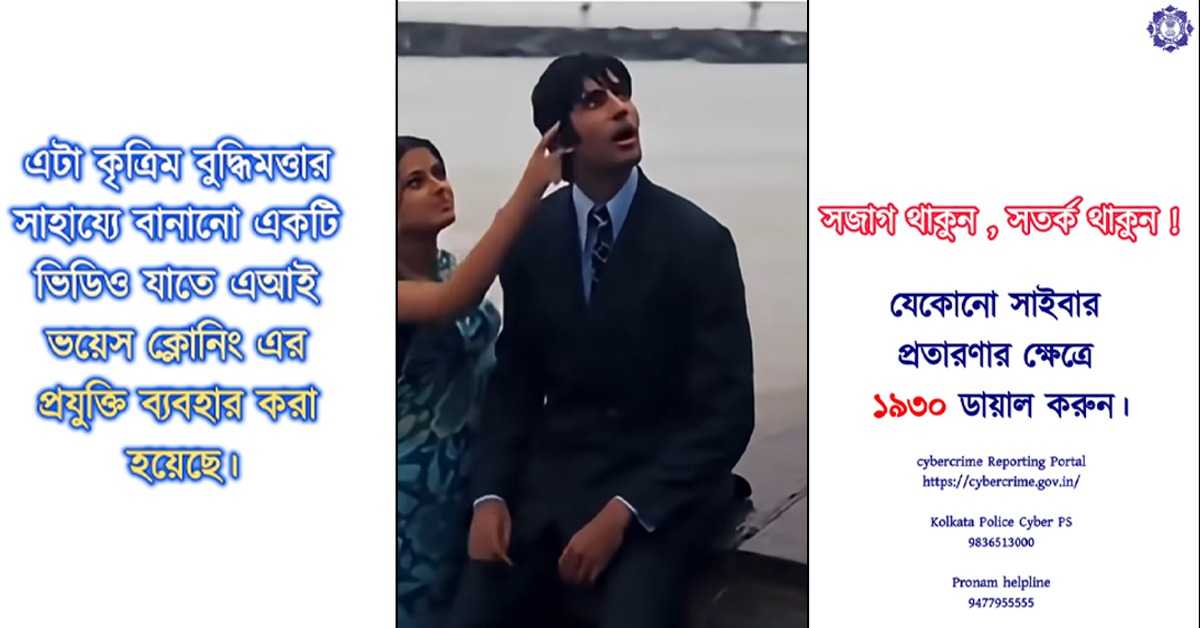 এআই (AI) ভয়েস ক্লোনিং এমন একটি প্রযুক্তি যা কৃত্রিম বুদ্ধিমত্তার (AI) মাধ্যমে কোনো ব্যক্তির কণ্ঠস্বর হুবহু নকল খুব সহজেই করতে পারে। এই প্রযুক্তির সাহায্যে একজন নির্দিষ্ট ব্যক্তির ভয়েস ডেটা ব্যবহার করে, একটি AI মডেলকে কণ্ঠস্বর নকল করার প্রশিক্ষণ দেওয়া হয়। এই নকল ভয়েসটি টেক্সট-টু-স্পিচ বা অন্যান্য অডিও অ্যাপ্লিকেশনগুলিতে ব্যবহার করা যায়। এই সুযোগ ব্যবহার করেই প্রতারণার ফাঁদ পেতেছে সাইবার প্রতারকরেরা। তাই এবার মাঠে নামল কলকাতা পুলিশ। এদিন নিজেদের সোশ্যাল হ্যান্ডেলে একটা ভিডিও পোস্ট করেছে কলকাতা পুলিশ। অমিতাভ বচ্চন ও মৌসুমী চট্টোপাধ্যায়ের কালজয়ী একটি ভিডিওতে আসল গানের বদলে দেওয়া হয়েছে অন্য একটি গান যেটা কোনভাবেই কিশোরে কুমারের গাওয়া নয়। এরপরেই বার্তা দিয়ে সতর্ক করা হয়েছে সাধারণ মানুষকে যাতে তাঁরা কোনমতেই হ্যাকারদের ফাঁদে পা না দেন। সেই বিষয়ে সতর্ক করে দেওয়া হয়েছে হেল্পলাইন নম্বরও।