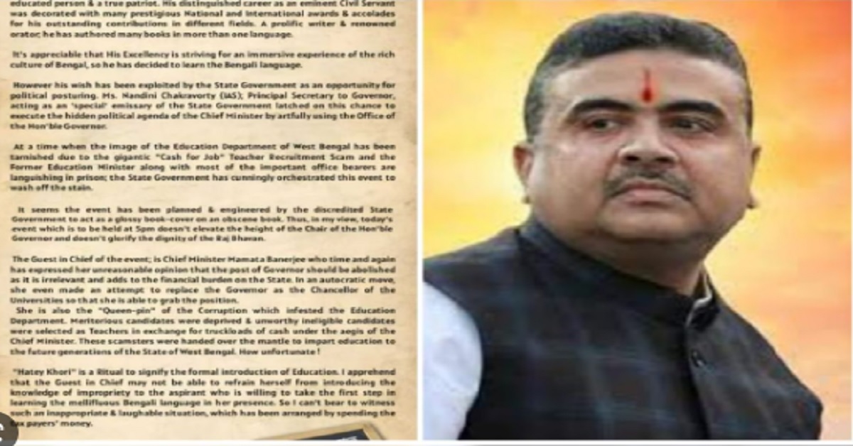 তাঁর পোস্টে শুভেন্দু লেখেন ,’যোগ্য প্রার্থীরা চাকরি পাননি অথচ টাকার বিনিময়ে অযোগ্যদের চাকরি হয়েছে। প্রাক্তন শিক্ষামন্ত্রী-সহ শিক্ষা দফতরের একাধিক আধিকারিক বর্তমানে জেলে রয়েছেন। এই পরিস্থিতিতে মুখ্যমন্ত্রীর উপস্থিতিতে রাজ্যপালের হাতেখড়ির অনুষ্ঠান কার্যত রাজনৈতিক স্বার্থে করা হচ্ছে’।