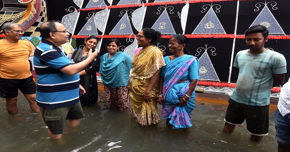 এর মধ্যেই আজ দ্বিতীয়া। চলছে শেষ মুহূর্তের প্রস্তুতি। স্থানীয় ক্লাব রামমোহন সম্মিলনীর মণ্ডপ শিল্পীরা এসেছেন মেদিনীপুর থেকে। এই বিপর্যয়ে তাঁদের পাশে দাঁড়ালেন কুণাল ঘোষ-সহ স্থানীয় মানুষ। পুজোর প্রধান উদ্যোক্তা কুণাল ঘোষ। কিন্তু এই বৃষ্টিতে যেমন মণ্ডপের ক্ষতি হচ্ছে, তেমনই একইসঙ্গে শিল্পীদের থাকা-খাওয়ারও চূড়ান্ত সমস্যা। সকাল থেকে রাস্তায় হাঁটুজলে নেমে পরিস্থিতি তদারক করলেন কুণাল। সঙ্গে ছিলেন ক্লাব-সদস্যরাও। এলাকার বাড়িতে বাড়িতে বেশি করে তৈরি হল খিচুড়ি। তাই দেওয়া হচ্ছে শিল্পীদের। একই সঙ্গে তাঁদের থাকার ব্যবস্থা করা হচ্ছে। শুধু নিজের পাড়ার পুজোই নয়, আশপাশের যে মণ্ডপগুলি আছে সেখানেও হাঁটুজল ভেঙে পরিস্থিতি সরেজমিনে দেখেন কুণাল। খবর নিলেন নিচু বাড়িতে, একতলায় থাকা মানুষজনেদের। সমস্যায়-পড়া রিকশাচালকদেরও পাশে থাকার আশ্বাস দেন তিনি।