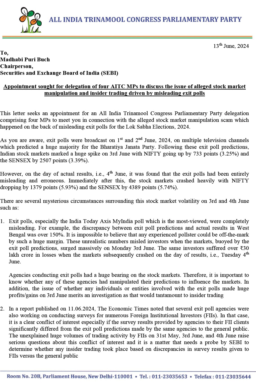 সেবি দফতরে তৃণমূলের প্রতিনিধি দলে থাকবেন লোকসভার মুখ্যসচেতক কল্যাণ বন্দ্যোপাধ্যায়, সাংসদ প্রতিমা মণ্ডল, রাজ্যসভার ডেপুটি লিডার সাগরিকা ঘোষ ও সাংসদ সাকেত গোখেল। তবে শেয়ার কেলেঙ্কারি ইস্যুতে তৃণমূলের প্রতিনিধি দলের সঙ্গে দেখা করার ব্যাপারে এখনও টালবাহানা চালাচ্ছে সেবি। তৃণমূলের অভিযোগ, যেভাবে ভুয়ো এক্সিট পোলকে পরিকল্পিতভাবে ব্যবহার করে শেয়ার মার্কেটে স্টক কেনাবেচাকে ইচ্ছেমতো প্রভাবিত করা হয়েছে তা এ-যাবৎকালের সবচেয়ে বড় কেলেঙ্কারি। তৃণমূলের রাজ্যসভার দলনেতা ডেরেক ও’ব্রায়েন জানান, তৃণমূল সাংসদরা সেবি সদর দফতরে যাওয়ার পাশাপাশি এনসিপি (শারদ গোষ্ঠী) প্রধান শারদ পাওয়ার ও মহারাষ্ট্রের প্রাক্তন মুখ্যমন্ত্রী তথা শিবসেনা (ইউবিটি) প্রধান উদ্ধব ঠাকরের সঙ্গেও দেখা করবেন। ইন্ডিয়া শিবিরের এই দুই দলের নেতৃত্বের কাছে তৃণমূলনেত্রীর বার্তা পৌঁছে দেবেন তাঁরা। লোকসভার সাংসদ কল্যাণ বন্দ্যোপাধ্যায় জানিয়েছেন, শেয়ার বাজারের বিরাট কেলেঙ্কারি নিয়ে অবিলম্বে তদন্তের দাবি জানাব আমরা। নির্বাচনী ফল প্রকাশের আগে এক্সিট পোল ফল নিয়ে যে ছিনিমিনি খেলা হয়েছে এবং পরবর্তী অধ্যায়ে ৪ জুন ফলপ্রকাশের দিন যেভাবে শেয়ার মার্কেটে ধস নেমেছে তার পুঙ্খানুপুঙ্খ তদন্ত করতে হবে। সেইসঙ্গে এই ঘটনায় যাদের পকেটে টাকা ঢুকেছে, যারা মুনাফা করেছে এবং যে ৩১ লক্ষ কোটি টাকা বাজার থেকে স্রেফ উধাও হয়ে গিয়ে ব্যাপক ক্ষতির মুখে পড়েছেন মধ্যবিত্ত ও সাধারণ মানুষ, সে-বিষয়েও সেবির বক্তব্য আমরা জানতে চাইব। বাজার নিয়ন্ত্রক সংস্থা হিসাবে কী পদক্ষেপ তারা নিতে চলেছে তাও আমরা তাদের কাছ থেকে জানতে চাইব।