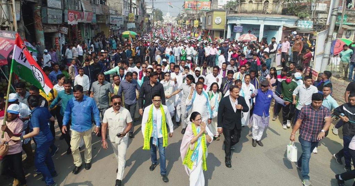 ১৬ ফেব্রুয়ারি ত্রিপুরায় বিধানসভা নির্বাচন (Assembly Election)। তার আগে এদিনের পদযাত্রা বুঝিয়ে দিল ত্রিপুরাতেও মমতার জনপ্রিয়তা। তা দেখে সেখানের শাসকদলের বুকে কাঁপন ধরা স্বাভাবিক। দুপুর ১২টার পরে রবীন্দ্র শতবার্ষিকী ভবন থেকে পদযাত্রা শুরু করেন মমতা বন্দ্যোপাধ্যায়। পাশে অভিষেক বন্দ্যোপাধ্যায়। রাজবাড়ির সামনে দিয়ে, জ্যাকসন গেট থেকে কামান চৌমুহনি, পোস্ট চৌমুহনি, প্যারাডাইস চৌমুহনি, বটতলা, ফায়ার সার্ভিস চৌমুহনি, খের চৌমুহনি, বিদুরকাতা চৌমুহনি ও আরএমএস চৌমুহনি হয়ে আবার রবীন্দ্র শতবার্ষিকী ভবনে ফেরে ব়্যালি। ৫ কিলোমিটার এই পদযাত্রা সেখানেই সভা তৃণমূল সুপ্রিমোর। থাকছেন সর্বভারতীয় সাধারণ সম্পাদকও। এদিন পদযাত্রার দিকে তাকালে দেখা গেল শুধুই জোড়াফুলের প্রতীক। আর সেই মিছিল ছাপিয়ে ভিড় রাস্তার দুধারে। মমতা-অভিষেককে একঝলক দেখতে দীর্ঘক্ষণ রোদ মাথায় দাঁড়িয়ে রয়েছেন উৎসাহী জনতা। বিজেপির অত্যাচার ও বঞ্চনার প্রতিবাদে তৃণমূলকেই যে ত্রিপুরার (Tripura- Agartala) মানুষ বিকল্প শক্তি হিসেবে ভাবছে সেটা স্পষ্ট বোঝাল এদিনের ভিড়।