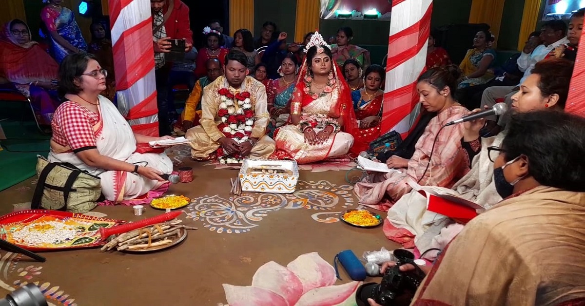 কনে যাদবপুর বিশ্ববিদ্যালয়ে গবেষণারত সোমাশ্রী বিশ্বাস। হিন্দুবিয়ের চলিত রীতি পাশে ঠেলে যজ্ঞের শিখাকে সাক্ষী রেখে বিশ্বজিৎ জানাকে স্বামী হিসেবে গ্রহণ করলেন। সিঁথিতে সিঁদুর পরলেন না। স্বামী তর্জনীতে দিলেন সিঁদুরের টিপ। সোমা তর্জনির সিঁদুরে রাঙালেন বিশ্বজিতের ললাট। সোনা-রুপোর অলঙ্কারের বৈভব ছিল না। ফুলের মালা-মুকুটে সাজিয়ে পিঁড়িতে বসেন সোমাশ্রী। কন্যাদানের চলতি রীতি বাতিল। গাঁটছড়ার গিঁটেও বর-কনে বাঁধা পড়লেন না। সোমাশ্রী-বিশ্বজিতের বিশ্বাস, মনের বাঁধনে, বিনি সুতোর বাঁধনে।