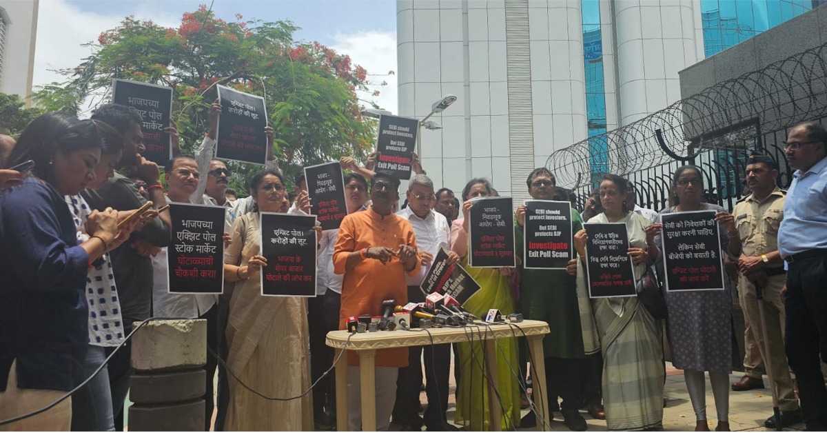 শেয়ার বাজারে দুর্নীতি নিয়ে মুম্বইয়ে সেবি-র (SEBI) দফতরের বাইরে তৃণমূল, শিবসেনা (উদ্ধব গোষ্ঠী) ও এনসিপির (শরদ গোষ্ঠী) নেতাদের প্রতিবাদ এবং স্লোগান। প্রতিবাদ চলাকালী নেতাদের হাতে প্ল্যাকার্ডে লেখা ছিল, সেবির উচিত বিনিয়োগকারীদের রক্ষা করা। কিন্তু সেবি বিজেপিকে রক্ষা করে। এক্সিট পোল কেলেঙ্কারির তদন্ত চাই।