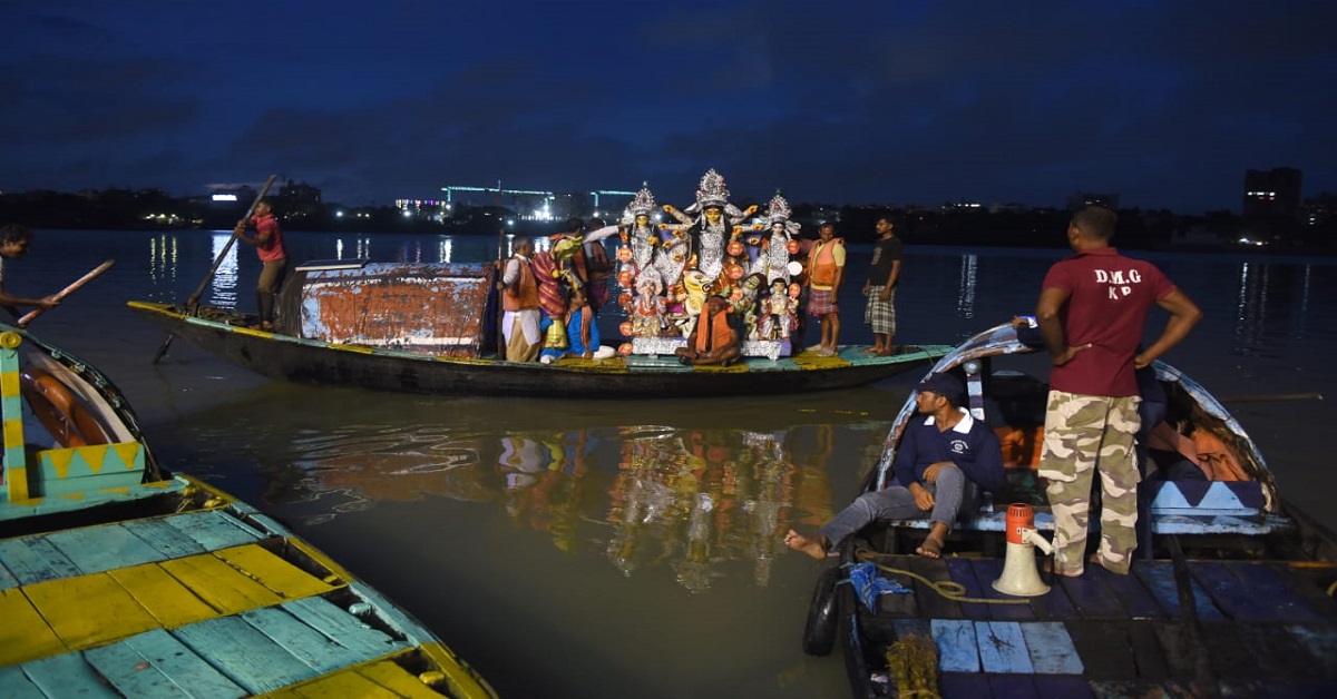 প্রতিবেদন : মন খারাপের দশমীতে বিষাদের সুরে উমাকে বিদায় জানাল বাঙালি। কলকাতার একের পর এক গঙ্গার ঘাটে হল কয়েকহাজার প্রতিমার নিরঞ্জন। আর শহর জুড়ে হাজারও শোভাযাত্রা আর প্রতিমা বিসর্জনের আয়োজন-পরিচালনায় ফুলমার্কস পেল পুরসভা ও পুলিশ প্রশাসন। প্রতিমা নিরঞ্জনকে কেন্দ্র করে প্রতিবছরের মতো এবছরও গঙ্গার ঘাটগুলির ব্যবস্থাপনা ও নিরাপত্তায় বাড়তি নজর রয়েছে রাজ্যের। পুলিশ ও পুরসভা সূত্রে খবর, খিদিরপুরের দইঘাট থেকে শুরু করে জাজেস ঘাট, বাবুঘাট, বাজেকদমতলা, নিমতলা, কুমোরটুলি, আহিরীটোলা ও বাগবাজার ঘাটে বৃহস্পতিবার বনেদিবাড়ি, বারোয়ারি কিংবা আবাসনের পুজো মিলিয়ে প্রায় হাজার পাঁচেক প্রতিমার নিরঞ্জন সম্পন্ন হয়।
