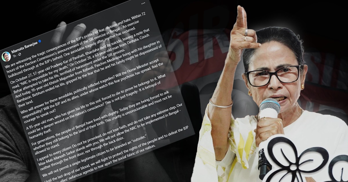 মুখ্যমন্ত্রী জানান, ২৭ অক্টোবর খড়দহের পানিহাটির বাসিন্দা ৫৭ বছর বয়সী প্রদীপ কর আত্মহত্যা করেন। মৃত্যুর আগে রেখে যাওয়া চিঠিতে তিনি লিখেছেন, “আমার মৃত্যুর জন্য এনআরসি দায়ী।” তার পরের দিন, ২৮ অক্টোবর কোচবিহারের দিনহাটায় ৬৩ বছর বয়সী এক ব্যক্তি আত্মহত্যার চেষ্টা করেন, হয়রানির আশঙ্কায় ভীত হয়ে। আর বুধবার পশ্চিম মেদিনীপুরের কোটওয়ালির বাসিন্দা, ৯৫ বছর বয়সী ক্ষিতীশ মজুমদার — যিনি ইলামবাজারে মেয়ের সঙ্গে থাকতেন — নিজের জীবন শেষ করেন, জমি হারানোর আতঙ্কে।