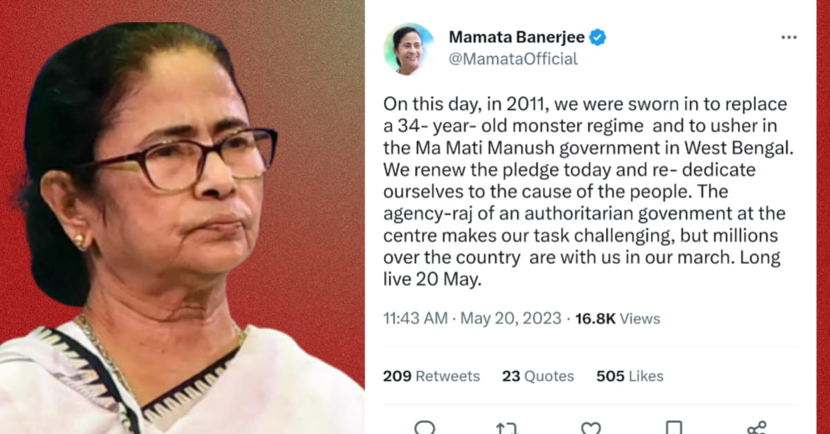 মমতা বন্দ্যোপাধ্যায় টুইটারে লেখেন, ‘এই দিনে, ২০১১ সালে, আমরা ৩৪ বছরের পুরানো দানব শাসনকে প্রতিস্থাপন করতে এবং পশ্চিমবঙ্গে মা মাটি মানুষ সরকার গঠনের শপথ নিয়েছিলাম। আমরা আজ অঙ্গীকার পুনর্নবীকরণ করি এবং জনগণের জন্য নিজেদেরকে উৎসর্গ করি। কেন্দ্রে কর্তৃত্ববাদী সরকারের এজেন্সি-রাজ আমাদের কাজকে চ্যালেঞ্জিং করে তোলে, কিন্তু সারাদেশে লক্ষ লক্ষ মানুষ আমাদের মিছিলে আমাদের সাথে আছে। দীর্ঘজীবী হোক ২০শে মে।’