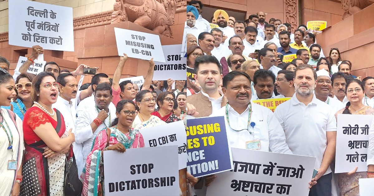 প্রতিবেদন : একাধিক ইস্যুতে সোমবার উত্তাল করে দিলেন ইন্ডিয়া জোটের সাংসদেরা। ভিতরে ও বাইরে দু-জায়গাতেই এনডিএ সরকারকে চেপে ধরেছেন তৃণমূল কংগ্রেস সাংসদেরা। সঙ্গে ছিলেন জোট শরিকেরাও। তিন নয়া কালাকানুন, কেন্দ্রীয় এজেন্সিগুলির অপপ্রয়োগ, অরবিন্দ কেজরিওয়াল-সহ আপের নেতা-মন্ত্রীদের জেলমুক্তি— এরকম একাধিক ইস্যুতে সংসদ-চত্বরে বিক্ষোভ দেখান বিরোধীরা। তৃণমূলের কল্যাণ বন্দ্যোপাধ্যায়, সুদীপ বন্দ্যোপাধ্যায়, সৌগত রায়, শতাব্দী রায়, ডাঃ কাকলি ঘোষ দস্তিদারদের সঙ্গে যোগ দেন রাহুল গান্ধী-সহ ইন্ডিয়া জোটের সাংসদেরা। হাতে প্ল্যাকার্ড-পোস্টার নিয়ে এনডিএ সরকার, প্রধানমন্ত্রী, স্বরাষ্ট্রমন্ত্রীর বিরুদ্ধে স্লোগান দিতে থাকেন সকলে। নয়া তিন কালাকানুনের (Bharatiya Nyaya Sanhita) বিরুদ্ধে প্রতিবাদস্বরূপ সোমবার রাজ্য জুড়ে আদালতগুলিতে কর্মবিরতি চালান আইনজীবীরা।