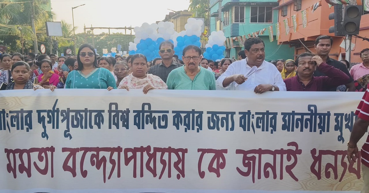 আরজি কর আবহ থেকে বেরিয়ে রাজ্যবাসীকে উৎসবে ফিরে আসতে আবেদন জানিয়েছিলেন মুখ্যমন্ত্রী। তা নিয়ে বিরোধীরা কটাক্ষ করতেও ছাড়েনি। বিরোধীদের মুখে ঝামা ঘষে উৎসবে ফেরার আবেদন নিয়ে পথে নামলেন বারুইপুরের দুর্গা উৎসব সমন্বয় কমিটির সদস্যরা। রবিবার বিকেলে বারুইপুর পদ্মপুকুর থেকে বারুইপুর রাস মাঠ পর্যন্ত পথযাত্রা করেন তাঁরা। বিমান বন্দ্যোপাধ্যায়ের নেতৃত্বে প্রায় ২০০ পুজো কমিটির সদস্যরা এই পদযাত্রায় অংশগ্রহণ করেন। এই পথযাত্রার অংশগ্রহণকারীদের দাবি, রাজ্যের বেশ কয়েকটি জেলা বন্যাকবলিত। কিন্তু বহু মানুষের জীবনজীবিকা নির্ভর করে এই দুর্গাপুজাের উপর। সারা বছর ধরে মানুষ পুজোর দিকে তাকিয়ে থাকেন। তাঁদের কথা মাথায় রেখেই মানুষ যাতে স্বতঃস্ফূর্তভাবে উৎসবে অংশগ্রহণ করেন সেই আবেদনও জানান উদ্যোক্তারা।