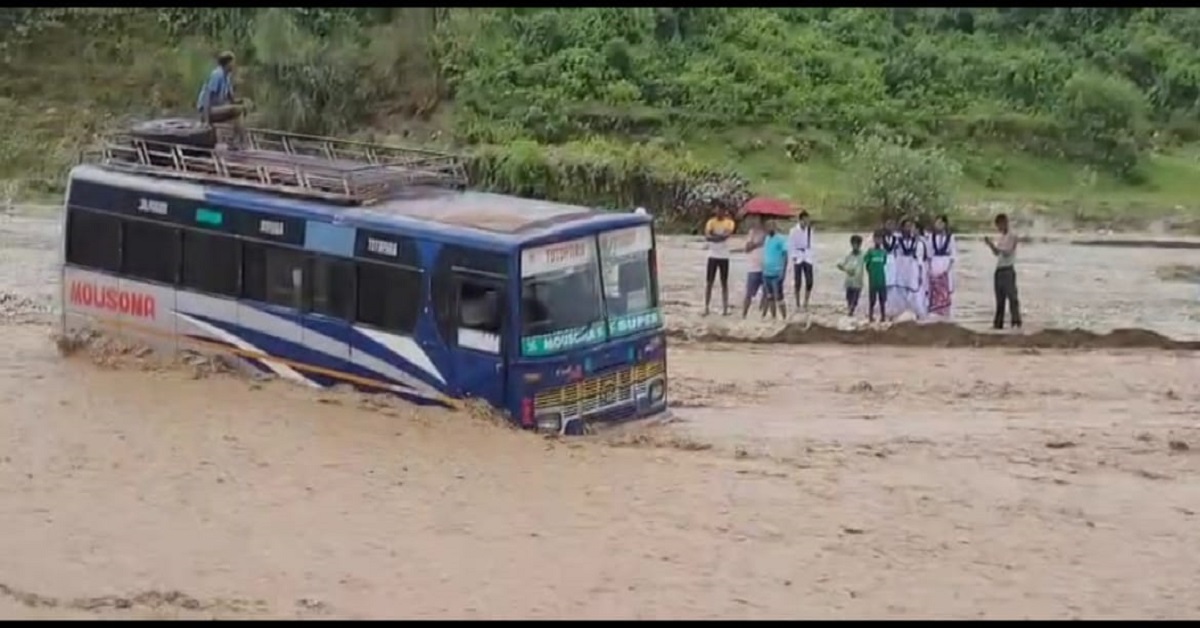 সংবাদদাতা, আলিপুরদুয়ার : হড়পা বানে মাঝনদীতে আটকে গেল যাত্রীবাহী বাস! বরাতজোরে রক্ষা পেলেন যাত্রীরা। বুধবার সকালে ভুটান পাহাড়ে প্রবল বর্ষণের ফলে ফের একবার হড়পা বান আসে বাঙড়ি নদীতে। আর এদিন আচমকা আসা সেই হড়পা বানে নদীর প্রায় মাঝামাঝিতে আটকে পড়ে একটি যাত্রীবাহী বাস। ঘটনাটি ঘটেছে মাদারিহাটে জামতলা এলাকায়। ভাগ্যের জোরে প্রাণে বেঁচে গেছেন টোটোপাড়া থেকে মাদারিহাটগামী ওই বাসের যাত্রীরা। কোনওক্রমে বাস থেকে নেমে প্রাণে বাঁচেন যাত্রীরা। ঘটনার খবর পেয়ে দ্রুত ঘটনাস্থলে পৌঁছয় মাদারিহাট থানার পুলিশ।