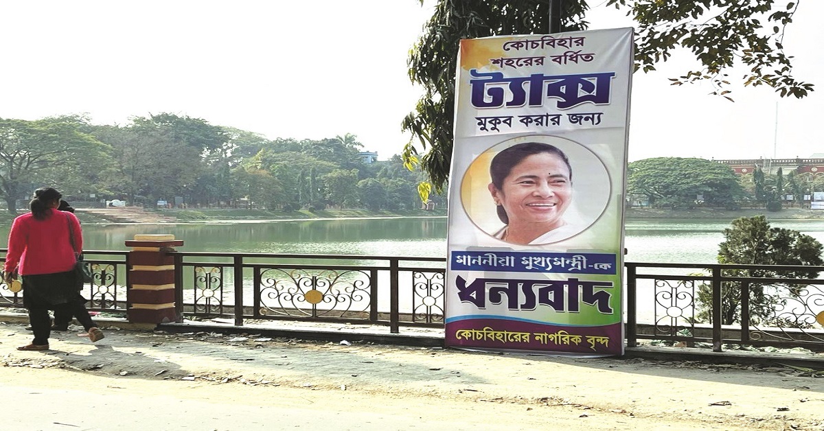সেই বর্ধিত করের চাপ থেকে মুক্তি পেয়ে খুশি কোচবিহারবাসী। তাই ধন্যবাদজ্ঞাপক পোস্টার।