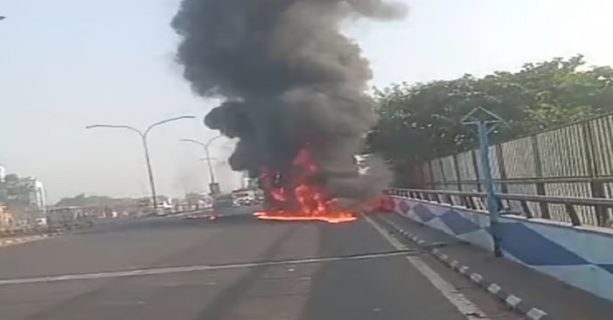 বুধবার সকালে বিদ্যাসাগর সেতুতে (Vidyasagar Setu) একটি যাত্রিবাহী বাসে হঠাৎ করেই আগুন ধরে যায়। সেতুর উপরেই জ্বলতে থাকে বাসটি। পরিস্থিতি বুঝতে পেরে দ্রুত যাত্রীদের নামিয়ে দেওয়া হয়। যদিও এদিনের ঘটনায় হতাহতের কোনও খবর নেই। খবর পেয়ে ঘটনাস্থলে পৌঁছয় দমকলের দু’টি ইঞ্জিন যায়। প্রায় ৩৫ মিনিটের চেষ্টায় আগুন নিয়ন্ত্রণে আনা হয়েছে।