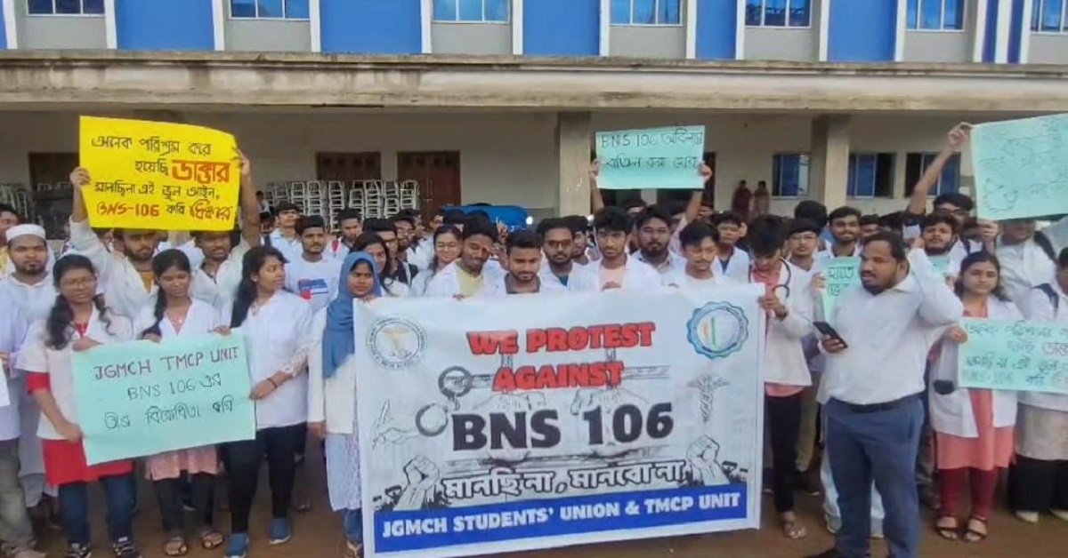 ভারতীয় ন্যায় সংহিতা ১০৬-এর এক নং ধারা বাতিলের দাবিতে সোমবার ঝাড়গ্রাম গভর্নমেন্ট মেডিক্যাল কলেজের চিকিৎসক ও ছাত্রছাত্রীরা প্রতীকী বিক্ষোভ প্রদর্শন করেন। যদি কেন্দ্রীয় সরকার ওই বিল বাতিল না করে, তাহলে আগামী তাঁরা আরও বৃহত্তর আন্দোলন সংগঠিত করবেন বলে জানান। তবে চিকিৎসা পরিষেবা বন্ধ রেখে নয়, চিকিৎসা পরিষেবা চালু রেখেই তারা আন্দোলন করবেন।