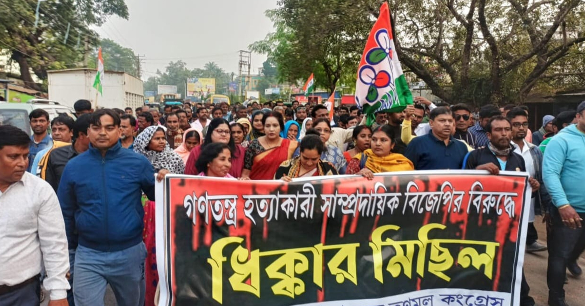 সংবাদদাতা, নদিয়া : মহুয়া মৈত্রকে (Mahua Moitra) সংসদ থেকে অনৈতিকভাবে বহিষ্কারের প্রতিবাদে শনিবার পথে নামল তৃণমূল। কৃষ্ণনগর লোকসভা কেন্দ্রের একাধিক স্থানে তো বটেই, গোটা রাজ্য জুড়ে হয়েছে প্রতিবাদ মিছিল, পথসভা ও বিক্ষোভ। কৃষ্ণনগর শহরে সভায় তৃণমূল ছাত্র পরিষদের ছাত্রছাত্রীরা যোগ দেন। রাজ্য সরকারি কর্মচারী ফেডারেশন মিছিল করে কৃষ্ণনগর পোস্ট অফিস মোড়ে পথসভা করে। সংগঠনের জেলা সভাপতি অতনু রায়ের দাবি, বহিষ্কারের সিদ্ধান্ত বাতিল করা হোক। তেহট্ট ১ ব্লকে মিছিলে নেতৃত্ব দেন বিধায়ক তাপস সাহা। চাপড়ার তৃণমূল ব্লক সভাপতি সুখদেব ব্রহ্ম বলেন, এভাবে মুখ বন্ধ করা যাবে না। নাকাশিপাড়ায় মিছিলের পুরোভাগে ছিলেন নাকাশিপাড়া ব্লক সভাপতি কনিষ্ক চট্টোপাধ্যায়। কৃষ্ণনগর ১ ব্লকের উত্তরের তৃণমূল সভাপতি দেবব্রত ঘোষ, তেহট্ট ২ ব্লক সভাপতি দেবাশিস বিশ্বাস মিছিল করেন। উত্তর দিনাজপুরের ইটাহার ব্লক তৃণমূল কংগ্রেসের ডাকে বিভিন্ন অঞ্চলে পঞ্চায়েত ও পঞ্চায়েত সমিতির জনপ্রতিনিধি ও দলীয় নেতা-কর্মীদের নিয়ে মিছিল হয়। ছিলেন বিধায়ক মোশারফ হোসেন, যোগেন্দ্রনাথ রায়, পূজা দাস, মোজাফফর হোসেন, রিনা সরকার প্রমুখ।