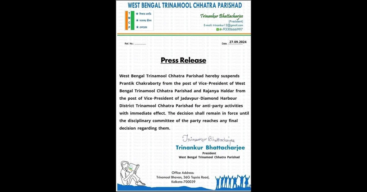 প্রতিবেদন : তৃণমূল ছাত্রপরিষদ থেকে সাসপেন্ড করা হল প্রান্তিক চক্রবর্তী ও রাজন্যা হালদারকে। শুক্রবার রাতে টিএমসিপির রাজ্য সভাপতি তৃণাঙ্কুর ভট্টাচার্য একটি বিজ্ঞপ্তি দিয়ে এখবর জানিয়ে দেন। তার আগে অবশ্য প্রাক্তন সাংসদ কুণাল ঘোষ সোশ্যাল মিডিয়ায় লেখেন, আরজি কর প্রসঙ্গ উল্লেখ করে একটি শর্টফিল্মের খবর এসেছে। এর সঙ্গে তৃণমূলের কোনও সম্পর্ক নেই। আমরা তিলোত্তমার ঘটনার ন্যায়বিচার চাই।