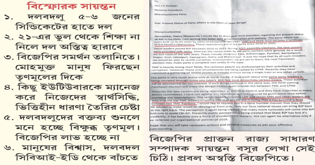 এই পত্রবোমায় ছত্রে ছত্রে শুভেন্দু ও তাঁর দলবলকে তোপ দেগে বলেছেন, কীভাবে এরা সিন্ডিকেট তৈরি করে রাজ্য বিজেপিকে কব্জা করেছে। কীভাবে টাকা দিয়ে সোশ্যাল মিডিয়ায় নিজেদের ঢাক নিজেরা পেটানোর ব্যবস্থা করেছে। বিজেপির প্রাক্তন রাজ্য সম্পাদক খুল্লামখুলা বলেছেন, কীভাবে কায়েমি স্বার্থে বিজেপির বিভিন্ন কমিটিতে নিজেদের লোক ঢুকিয়েছে শুভেন্দুদের সিন্ডিকেট। মূলত ২০১৯-এর পর দলবদলে বিজেপিতে ঢোকা নেতাদের জন্যই যে বাংলায় বিজেপি রুগ্ণ হয়ে পড়েছে সেকথাও স্পষ্ট লিখেছেন সায়ন্তন। এঁরা যে এজেন্সি থেকে বাঁচতেই বিজেপিতে এসেছেন তাও লিখেছেন সায়ন্তন। এঁরাই বাংলায় বিজেপির গ্রাউন্ড রিয়েলিটি কেন্দ্রীয় নেতাদের বলছেন না নিজেদের অপদার্থতা আড়াল করতে। এ যেন নন্দীগ্রামে বিজেপির পদ ছাড়া নেতাদের কথারই প্রতিধ্বনি।