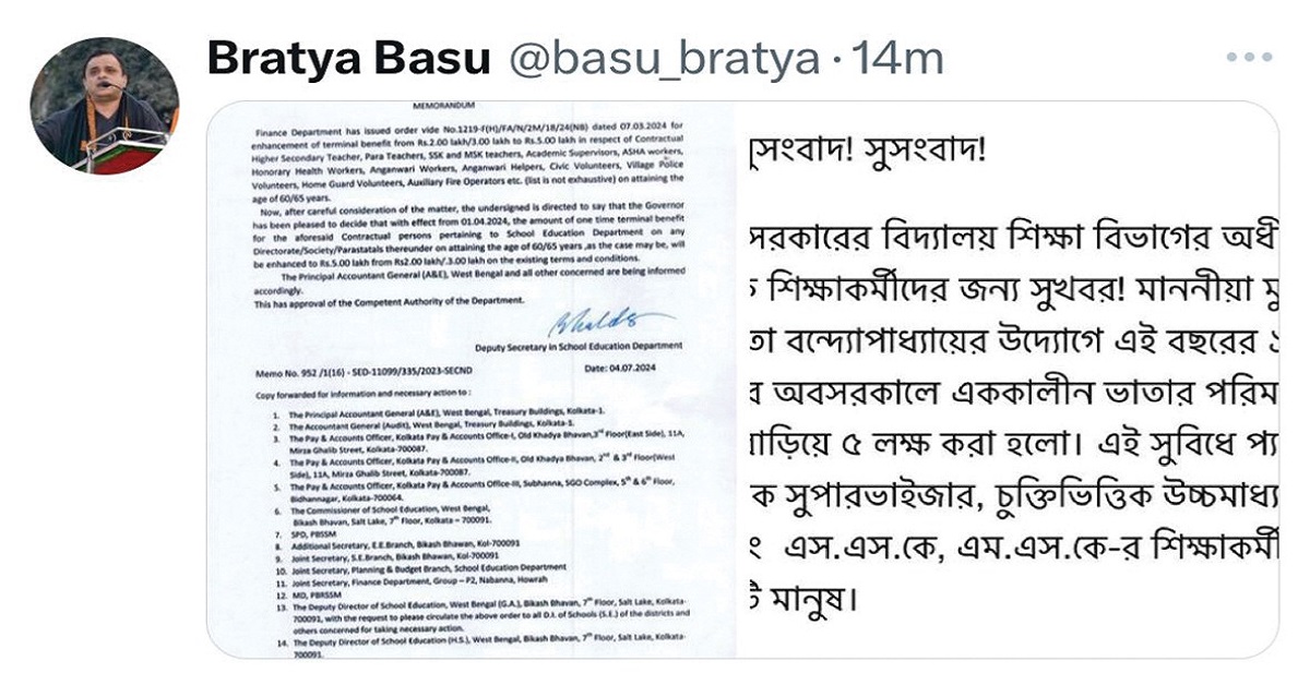 এদিন এক্স হ্যান্ডেলে ব্রাত্য বসু জানান, পশ্চিমবঙ্গ সরকারের বিদ্যালয়ের শিক্ষাবিভাগের অধীন সমস্ত চুক্তিভিত্তিক শিক্ষাকর্মীদের জন্য সুখবর। মুখ্যমন্ত্রী মমতা বন্দ্যোপাধ্যায়ের উদ্যোগে এই বছরের ১ এপ্রিল থেকে তাঁদের অবসরকালের এককালীন ভাতার পরিমাণ বাড়িয়ে ৫ লক্ষ টাকা করা হল। এই সুবিধে প্যারাটিচার, অ্যাকাডেমিক সুপারভাইজার, চুক্তিভিত্তিক উচ্চমাধ্যমিক শিক্ষক এবং এসএসকে, এমএসকে-এর শিক্ষাকর্মীরাও পাবেন। প্রসঙ্গত, এতদিন এই কর্মীরা দু লাখ থেকে তিন লাখ টাকা পেতেন অবসরকালে এককালীন ভাতা হিসেবে। সেই টাকার পরিমাণ বৃদ্ধি করে পাঁচ লাখ টাকা করা হল। মা-মাটি-মানুষের সরকারের লক্ষ্যই হল, বাংলার মানুষের সার্বিক উন্নয়ন। কেন্দ্রের বঞ্চনা সত্ত্বেও মুখ্যমন্ত্রী মমতা বন্দ্যোপাধ্যায়ের নেতৃত্বাধীন সরকার নিরলসভাবে কাজ করে চলেছে।