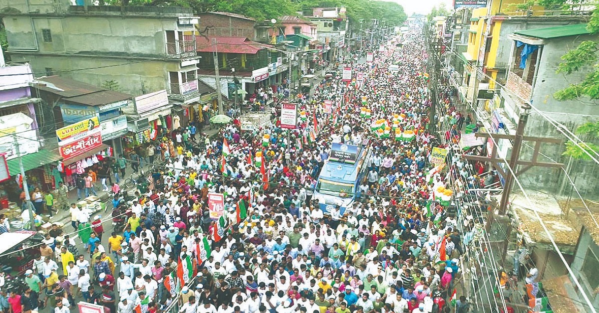 বিশ্বজিৎ চক্রবর্তী, আলিপুরদুয়ার: জনসমুদ্রে ভেসে তৃণমূল প্রার্থী প্রকাশ চিক বড়াইকের সমর্থনে মঙ্গলবার আলিপুরদুয়ারে রোড-শো করলেন অভিষেক বন্দ্যোপাধ্যায়। কোচবিহারের জনসভা সেরে আলিপুরদুয়ারে পৌঁছন তৃণমূলের সর্বভারতীয় সাধারণ সম্পাদক। এখানকার কলেজ হল্ট থেকে আলিপুরদুয়ার চৌপথি পর্যন্ত প্রকাশ চিক বড়াইককে সঙ্গে নিয়ে রোড-শো করেন অভিষেক। সব জায়গার মতো এখানেও জনসমুদ্র চোখে পড়ে। যেদিকেই চোখ যায় শুধু কালো মাথা। রোড-শো শেষে গাড়ির মাথায় দাঁড়িয়েই বক্তব্য রাখেন অভিষেক। ব্যাখ্যা করে বলেন, কেন বাংলা বিরোধীদের এখানে ঠাঁই নেই।