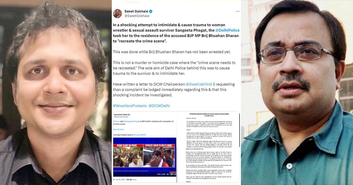 সাকেত তাঁর টুইটে লেখেন, “নিপীড়িত মহিলা কুস্তিগিরকে ভয় দেখানো এবং আতঙ্ক সৃষ্টি করার দিল্লি পুলিশের একটি জঘন্য প্রচেষ্টা। “অপরাধের দৃশ্য পুনর্নির্মাণ” করতে তাঁকে অভিযুক্ত BJP সাংসদ ব্রিজ ভূষণ শরণের বাসভবনে নিয়ে যায়। এটি করা হল যখন ব্রিজভূষণ গ্রেফতার হননি। এটি একটি হত্যা বা হত্যা মামলা নয়, যেখানে “অপরাধের দৃশ্যটি পুনরায় তৈরি করা দরকার।” এর পিছনে দিল্লি পুলিশের একমাত্র লক্ষ্য ছিল অভিযোগকারিনীকে আঘাত করা এবং তাঁকে ভয় দেখানো।“ টুইটে DCW চেয়ারপার্সন স্বাতী মাওয়ালকে একটি চিঠি লিখেছেন অবিলম্বে এই বিষয়ে একটি অভিযোগ দায়ের জন্য অনুরোধ করেন সাকেত।