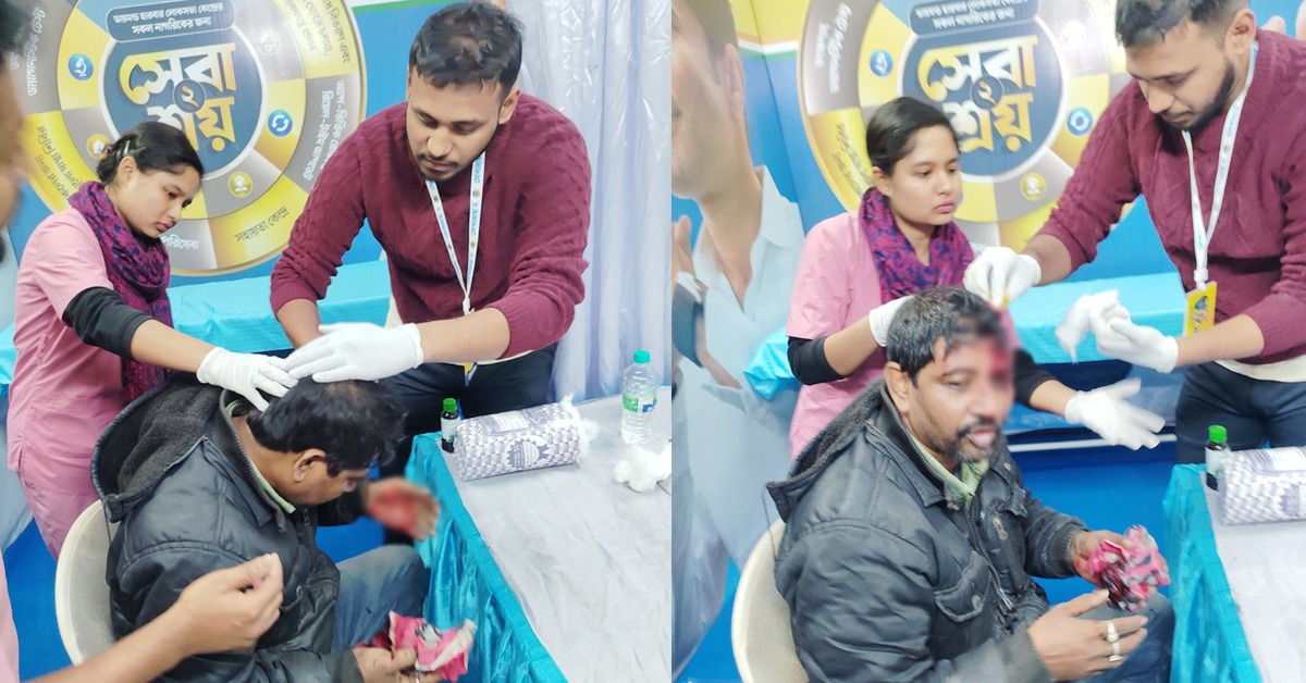 শুক্রবার দুপুরে মহেশতলার সম্প্রীতি ফ্লাইওভারের নীচে দুর্ঘটনায় আহত হন অভিজিৎ বর। স্থানীয় বাসিন্দারা ঘটনাটি দেখেই দ্রুত তাঁকে ডাকঘরের কাছে থাকা সেবাশ্রয় ক্যাম্পে নিয়ে যান। মুহূর্তের মধ্যেই স্থানীয় তৃণমূল কংগ্রেস নেতৃত্বও ক্যাম্পে পৌঁছন এবং চিকিৎসকেরা দ্রুত চিকিৎসা শুরু করেন। চিকিৎসকরা জানান, অভিজিৎ-এর মাথা, হাত ও পায়ে গুরুতর আঘাতে রক্তক্ষরণ হচ্ছিল। সেবাশ্রয়ের (Sebaashray 2) প্রস্তুতি ও তৎপরতার ফলে তিনি মুহূর্তের মধ্যে প্রয়োজনীয় চিকিৎসা পান। তাঁর মাথায় সেলাইও করা হয়।
