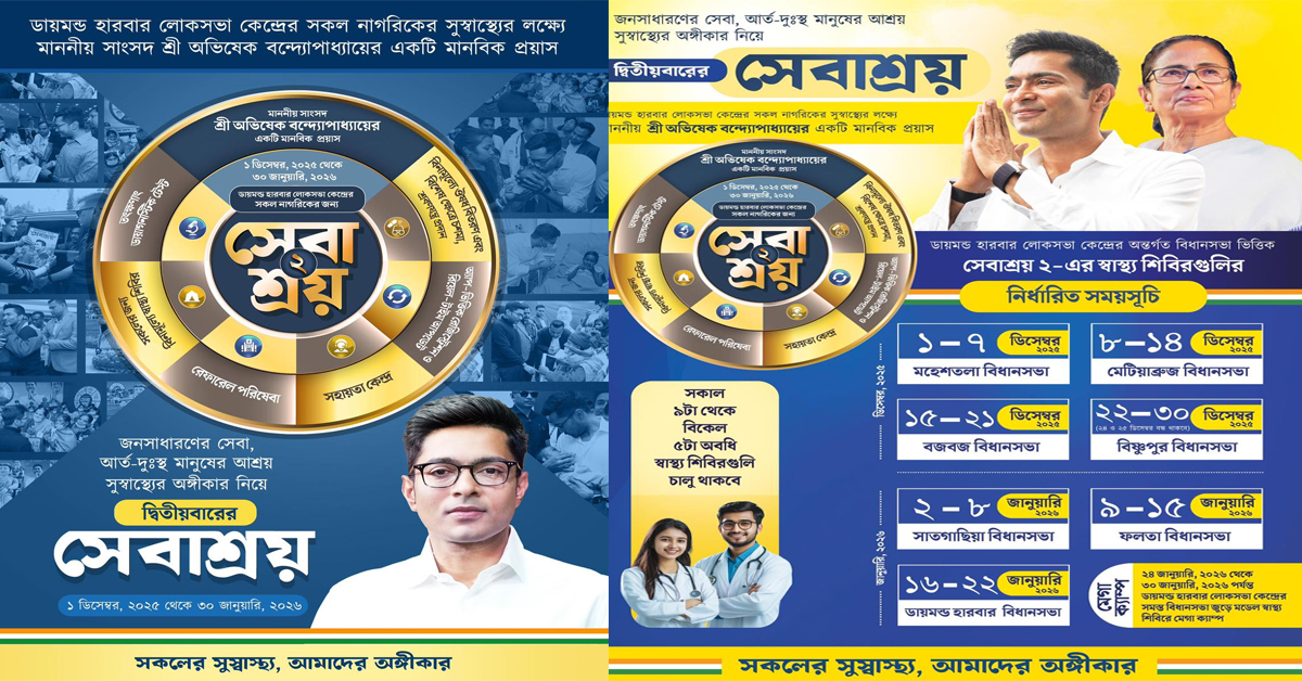 সোশ্যাল মিডিয়ায় অভিষেক জানিয়েছেন, “মানবসেবার কর্তব্যকে শিরোধার্য করে, স্বাস্থ্যসেবার মৌলিক অধিকারকে নিশ্চিত করতে আমি ‘সেবাশ্রয়’-এর উদ্যোগ গ্রহণ করেছিলাম। ডায়মন্ড হারবার লোকসভার সকল নাগরিক-সহ বাংলার বিভিন্ন প্রান্তের মানুষকে বিনামূল্যে স্বাস্থ্য-পরিষেবা দিতে পেরে আমি অন্তরের অন্তস্তল থেকে খুশি হয়েছিলাম। ডায়মন্ড হারবার লোকসভা কেন্দ্রের মানুষের বিশ্বাস, আস্থা ও ভরসার নির্ভরযোগ্য সেবাস্থল হয়ে উঠেছিল ‘সেবাশ্রয়’। কথা দিয়েছিলাম, আবারও এই ‘সেবাশ্রয়’ ফিরবে। ডায়মন্ড হারবার লোকসভা কেন্দ্রের সকল নাগরিকের সেবার্থে আবারও শুরু হচ্ছে ‘সেবাশ্রয় ২’ (sebaashray 2)। ১ ডিসেম্বর, ২০২৫ থেকে ‘সেবাশ্রয় ২’-এর স্বাস্থ্য শিবিরগুলি চলবে ২২ জানুয়ারি ২০২৬ পর্যন্ত। ২৪ জানুয়ারি থেকে ৩০ জানুয়ারি, ২০২৬ পর্যন্ত ডায়মন্ড হারবার লোকসভা কেন্দ্রের সমস্ত বিধানসভা জুড়ে চলবে মেগা ক্যাম্প। স্বাস্থ্য শিবিরগুলি সকাল ৯টা থেকে বিকেল ৫টা পর্যন্ত চালু থাকবে। সাধারণ মানুষের সেবা এবং আর্ত-দুঃস্থ মানুষের আশ্রয় – এই আদর্শকে পাথেয় করেই দ্বিতীয়বারের ‘সেবাশ্রয়’ ফিরছে আপনাদের জন্য।