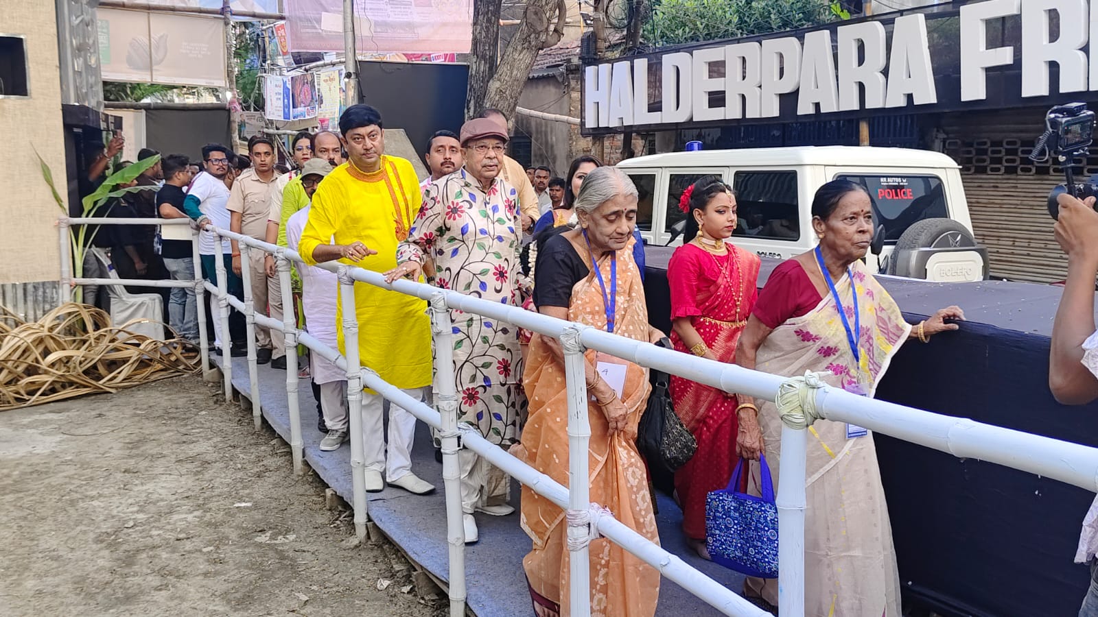 মহাষষ্ঠীর দিন মধ্য হাওড়া যুব তৃণমূল কংগ্রেসের (Trinamool Congress) উদ্যোগে প্রায় ৭৫ জন বয়স্ক-বয়স্কা মন্ডপে ঘুরে ঘুরে প্রতিমা দর্শন করলেন। টোটোয় করে তাঁদের মধ্য হাওড়ার বিভিন্ন পুজোমন্ডপে ঘুরিয়ে ঠাকুর দেখানোর ব্যবস্থা করেন যুব তৃণমূলের কর্মীরা। মধ্য হাওড়ার হালদারপাড়া ফ্রেন্ডস অ্যাসোসিয়েশন ক্লাবের পুজো থেকে এদিন তাঁদের প্রতিমা দর্শন হয়।