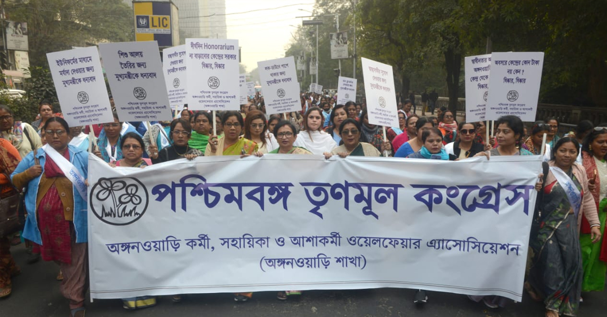 প্রতিবেদন : কেন্দ্রীয় বঞ্চনার প্রতিবাদে আইসিডিএস (ICDS) কর্মী ও সহায়কদের নিয়ে পথে নামল তৃণমূল। কলকাতার রাজপথে এই মিছিল থেকে আইসিডিএস কর্মী-সহায়করা বার্তা দিলেন, কেন্দ্রীয় সরকার শুধুই বঞ্চনা করেছে, একমাত্র পাশে দাঁড়িয়েছেন আমাদের দিদি, আমাদের মুখ্যমন্ত্রী। মিছিলে নেতৃত্ব দিয়ে নারী ও শিশু কল্যাণ দফতরের মন্ত্রী ডাঃ শশী পাঁজা ও তৃণমূল মহিলা কংগ্রেসের সভানেত্রী মন্ত্রী চন্দ্রিমা ভট্টাচার্য আইসিডিএস প্রকল্প বন্ধের চক্রান্তে ধিক্কার দেন কেন্দ্রীয় সরকারকে। সেইসঙ্গে আইসিডিএস কর্মী ও সহায়িকাদের নির্দেশ দেন কেন্দ্রীয় বঞ্চনার কথা দিকে দিকে ছড়িয়ে দিতে।
