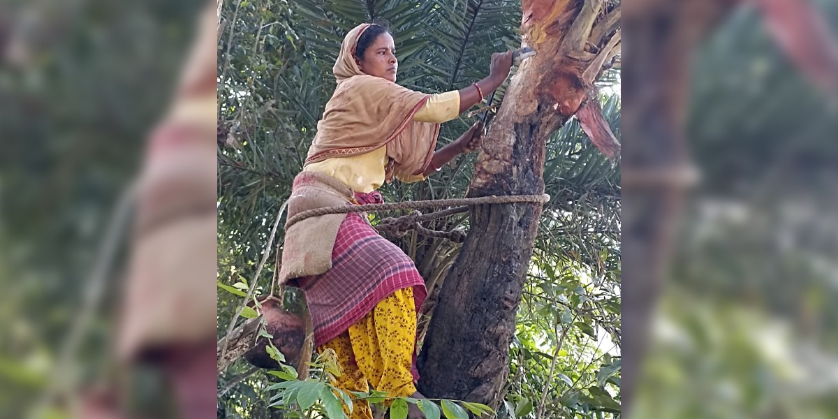 সংবাদদাতা, হুগলি: কথায় বলে নারীকে চেনা যায় স্বামীর অভাবে। এবার কেমন পরিস্থিতি চাক্ষুষ করা গেল জয়নগরের দু নম্বর ব্লকের মণিপুর বাঁশতলা এলাকায়। সংসারের হাল ধরার জন্য স্বামীর সাথে কাঁধে কাঁধ মিলিয়ে খেজুর গাছে হাড়ি বাঁধছেন জেলার প্রথম মহিলা শিউলি মাজিদা লস্কর।