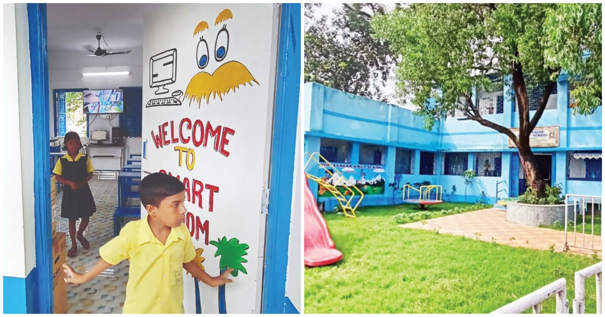 নীলাঞ্জন ভট্টাচার্য : শিক্ষাবিস্তারের আধুনিকতায় এখন পরস্পরকে টেক্কা দেওয়ার পালা। আর এই টেক্কা দেওয়ার খেলায় এখন পিছিয়ে নেই কলকাতা পুরসভার স্কুলও। ধাপার হাটগাছিয়ার ‘বিদ্যাসাগর প্রাথমিক বিদ্যালয়’ (Vidyasagar Primary School) তারই উজ্জ্বল প্রমাণ। কলকাতা পুরসভার আন্তরিক উদ্যোগে একদিন প্রায় হারিয়ে যেতে বসা এই প্রাথমিক বিদ্যালয়টির ‘স্মার্ট ক্লাস’ এখন প্রকৃত অর্থেই এক বিস্ময়। ব্ল্যাকবোর্ড বা চক-ডাস্টার নয়, দেওয়ালে এখন শোভা পাচ্ছে স্মার্ট এলইডি স্ক্রিন। স্কুলের সামনে সবুজের সমারোহ, সঙ্গে দোলনাও। রয়েছে মনের মতো খেলনাও। সবুজ শিশুমনের বিকাশে এর থেকে উপযোগী পরিবেশ আর কীই বা হতে পারে! এই মডেলই ধীরে ধীরে পুনরুজ্জীবনের পথ দেখাবে শহরের ঝিমিয়ে-পড়া পুরসভার স্কুলগুলিকে। ধাপে ধাপে এই স্কুলগুলিকে রূপান্তরিত করা হবে ইংলিশ মিডিয়ামে। লাখো টাকা খরচ করে আর বাচ্চাদের নিয়ে দৌড়তে হবে না নামীদামি কনভেন্ট স্কুলে। কিংবা অর্থের অভাবে আর অপূর্ণ থাকবে না অভিভাবকদের স্বপ্ন।