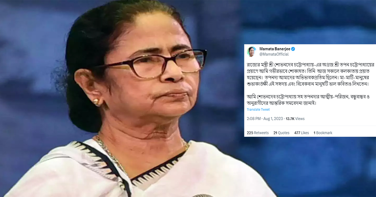 টুইটারে শোকজ্ঞাপন করে মুখ্যমন্ত্রী লিখেছেন, “রাজ্যের মন্ত্রী শোভনদেব চট্টোপাধ্যায়-এর অগ্রজ তপন চট্টোপাধ্যায়ের প্রয়াণে আমি গভীরভাবে শোকাহত। তিনি আজ সকালে কলকাতায় প্রয়াত হয়েছেন। তপনদা আমাদের অভিভাবকপ্রতিম ছিলেন। মা-মাটি-মানুষের শুভাকাঙ্ক্ষী এই সহৃদয় এবং বিবেকবান মানুষটি ভাল কবিতাও লিখতেন। আমি শোভনদেব চট্টোপাধ্যায় সহ তপনদার আত্মীয়-পরিজন, বন্ধুবান্ধব ও অনুরাগীদের আন্তরিক সমবেদনা জানাই।“