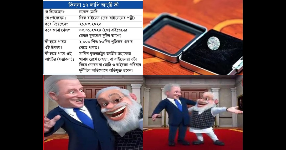 আর এরকম একটা দেশের ‘ফকির’ ‘প্রধান সেবক’ নরেন্দ্র মোদি আমেরিকায় তাঁর বন্ধু বাইডেনের স্ত্রী জিল বাইডেনকে হোয়াইট হাউসে গিয়ে যে আংটি উপহার দিয়ে এসেছেন ২১ জুন ২০২৩-এ, সেটির মূল্য ১৭ লক্ষ টাকা (২০ হাজার ডলার)। হীরের ওজন ৭.৫ ক্যারেট। সুরাটের কারখানায়, কৃত্রিম হীরে দিয়ে বানানো ওই আংটি ‘কার-এ-কলমদানি’ নামে এক বিশেষ কাশ্মিরী বাক্সে করে ওয়াশিংটন সফরের সময় বাইডেন-পত্নীকে দেন মোদি। করদাতাদের টাকায় এই বদান্যতা। আর সেটা জানা গেল, কারণ খোদ হোয়াইট হাউস উপহারের তালিকা প্রকাশ করেছে। আর উপহারের মূল্য সমেত তালিকাটি প্রকাশিত হয়েছে। বাইডেনের মেয়াদের শেষবেলায় যদি না এই তালিকা প্রকাশিত হত, তবে গোদি মিডিয়ার সুচারু কৌশলে এসব খবর বাইরে আসতই না। তা নিয়ে হইচইও হত না।
