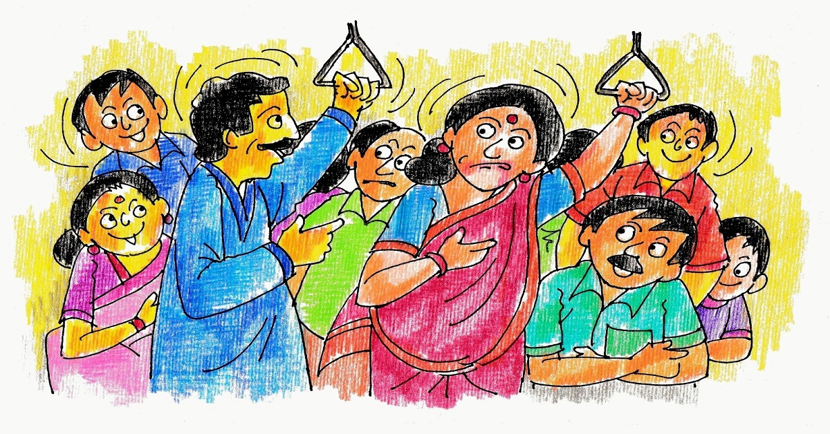 কম্পার্টমেন্টে গিজগিজ ভিড়, প্রচুর পুরুষ-মহিলা। সবাই মোটামুটি উদাসীন। অল্পবয়সী ছেলে-মেয়েরা চেঁচামেচির জায়গা থেকে যতটা সম্ভব দূরত্ব বাড়িয়ে দাঁড়াল। ট্রেন বাসের ভিড়ে এসব নতুন নয়। পুরুষরা ভিড়টাকে ঢাল হিসেবে ব্যাবহার করে— যেন কোনও ইচ্ছে ছিল না, ভিড়ের জন্যই কাছাকাছি থাকা মহিলাটির এখানে-ওখানে হাত-টাত রেখেছে। আবার মহিলারাও সুবিধাজনক অবস্থানে দাঁড়ানোর জন্য শরীরে শরীর লাগিয়ে জায়গা বার করে নেয়। চোখ বুজে অপেক্ষায় ছিলাম, চেঁচামেচি থামলেই আরেকটু ঝিমিয়ে নেব। হঠাৎ পুরুষটি হুঙ্কার দিল, আপনার এত অসুবিধা হলে সামনের স্টেশনে নেমে অ্যাপ ক্যাব নিন। ভিড়ে এসব অসুবিধা একটু মানিয়ে নিতে হয়।