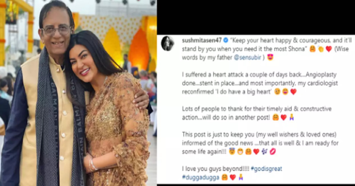 হৃদরোগে আক্রান্ত হয়েছেন প্রাক্তন মিস ইউনিভার্স সুস্মিতা সেন (Susmita Sen)। তাঁর অ্যাঞ্জিয়োপ্লাস্টি করে হার্টে স্টেন্ট বসানো হয়েছে। হৃদরোগের কথা নিজেই জানিয়েছেন অভিনেত্রী সুস্মিতা। তাঁর বাবার সঙ্গে তোলা ছবি পোস্ট করে সুস্মিতা লিখেছেন, নিজের হৃদয়কে খুশি রাখো এবং সাহসী করে তোলো। দরকারের সময় সে অবশ্যই তোমার পাশে থাকবে। আমার বাবা আমাকে একথা বলেছিলেন।
