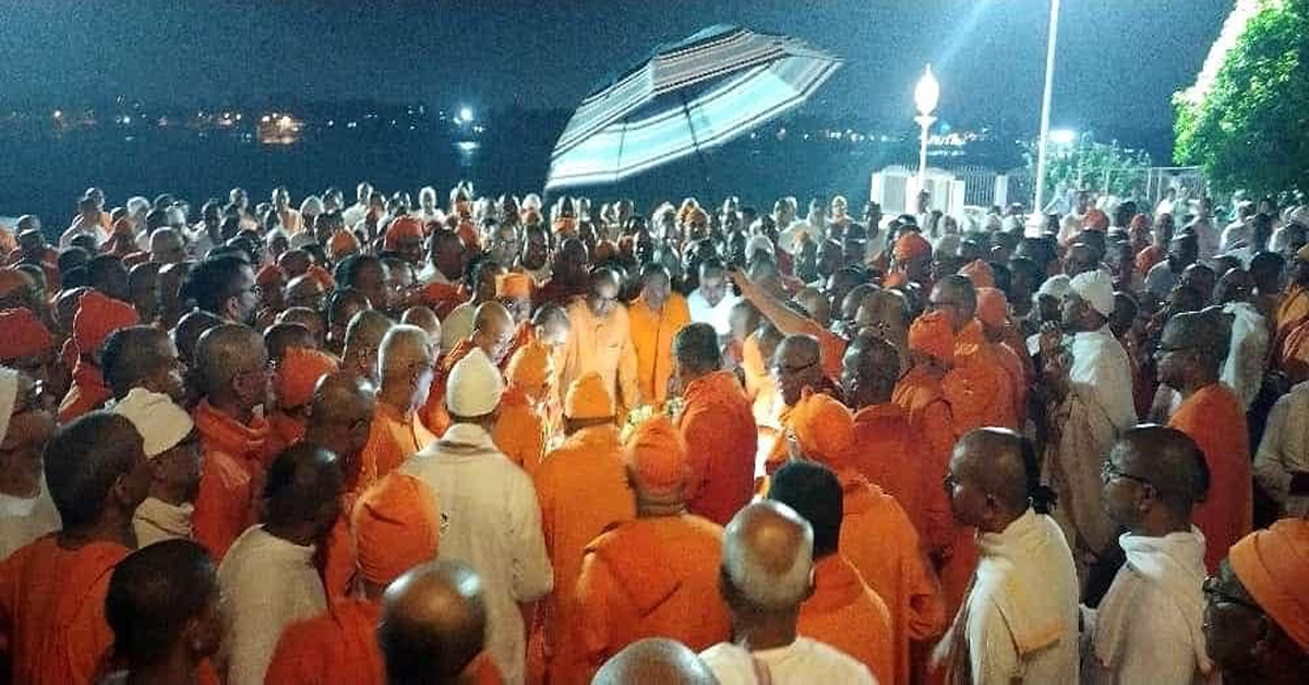 সাংস্কৃতিক ভবনে ঠাকুর রামকৃষ্ণ পরমহংসদেব, বিবেকানন্দ ও শ্রী সারদা মায়ের পায়ের কাছে রাত ৮টা পর্যন্ত অধ্যক্ষ মহারাজের দেহ শায়িত থাকে এরপর মায়ের সামনে তাঁকে গঙ্গাস্নান করিয়ে নববস্ত্র পরানো হয়। সেখানে সন্ন্যাসীরা সমস্ত উপাচার পালন করেন। মঠ চত্বরে মহারাজের দেহ ঘোরানো হয়। রামকৃষ্ণদেবের মূল মন্দির, ব্রহ্মানন্দের মন্দির, স্বামীজির মন্দির হয়ে বেলুড় মঠে গঙ্গার তীরে মহারাজদের জন্য নির্দিষ্ট অন্ত্যেষ্টি ক্রিয়া স্থলে তাঁর দেহ নিয়ে যাওয়া হয়। সেখানে সম্পূর্ণ চন্দন কাঠে অধ্যক্ষ মহারাজের শেষকৃত্য সম্পন্ন হয়। বেলুড় মঠের সন্ন্যাসী ও মহারাজররা সমবেত রামকৃষ্ণশ্লোক-গান ও মন্ত্রোচ্চারণ করতে থাকেন।