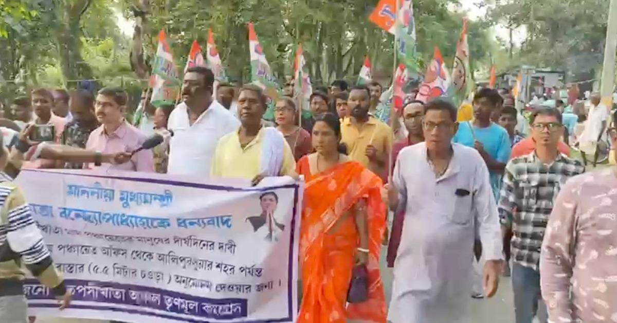 সংবাদদাতা, আলিপুরদুয়ার : মুখ্যমন্ত্রী মমতা বন্দ্যোপাধ্যায়ের (CM Mamata Banerjee) উদ্যোগে তৈরি হয়েছে রাস্তা। আলিপুরদুয়ার এক নম্বর ব্লকের বনচোকামারিতে নতুন রাস্তার কাজ শুরু হতেই মুখ্যমন্ত্রীকে ধন্যবাদ জানিয়ে তৃণমূলের বিশাল মিছিলে যোগ দিলেন স্থানীয় বাসিন্দারা। স্থানীয়দের দীর্ঘদিনের দাবিকে মান্যতা দিয়ে আলিপুরদুয়ার এক নম্বর ব্লকের বনচোকামারি গ্রাম পঞ্চায়েত এলাকায় পহেলা বৈশাখ শিলান্যাস হয়েছে প্রায় ১২ কিলোমিটার রাস্তার। এই রাস্তা নির্মাণে খরচ হবে প্রায় ১২ কোটি টাকা। দীর্ঘদিনের দাবি পূরণ হওয়ায় খুশিতে মিছিলে যোগ দেয় সাধারণ মানুষ। এই রাস্তার মাধ্যমে বনচোকামারি গ্রাম পঞ্চায়েতকে যেমন জেলা সদরের সাথে সংযুক্ত করা হচ্ছে, তেমনি অপর দিকে ৩১ নম্বর জাতীয় সড়কের নিমতি চৌপতি থেকে তপসিখাতা হয়ে কোচবিহার যাবার নতুন পথও খুলে যাচ্ছে। ১২ কিলোমিটার দীর্ঘ এই রাস্তাটি ৫.৫ মিটার পর্যন্ত প্রশস্ত করা হবে, যার ফলে এই অঞ্চলে যোগাযোগ ব্যবস্থা অনেকটাই উন্নত হবে। রাস্তাটি বনচোকামারির গরম সেতু থেকে শুরু হয়ে তপসি খাতা গ্রাম পঞ্চায়েতের কালজানি ঘাট হয়ে জয়বাংলা হাট পর্যন্ত নির্মিত হবে।