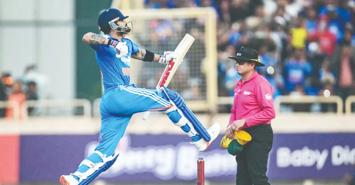 ১০২ বলে সেঞ্চুরি করেছিলেন বিরাট। প্রত্যেকটা শটে ঠিকরে বেরিয়েছে গুয়াহাটির জবাব। শেষমেশ ১২০ বলে ১৩৫। কিছুটা অধৈর্য হয়ে দূর থেকে বার্গারকে মিড অফের উপরে ওড়াতে গিয়েছিলেন। দৌড়ে ক্যাচ ধরলেন রিকেলটন। বিরাট রাজার প্রবেশের সময় গ্যালারির যে উচ্ছ্বাস ছিল, প্রস্থানে সেটা দশগুণ বেড়ে গেল। জনতা লাফাচ্ছে আর তিনি মাঠের চারদিকে ব্যাট দেখাচ্ছেন। এই মাঠে আগে দুটি সেঞ্চুরি করেছিলেন। প্রচুর রান আছে। যেভাবে বিদায় নিলেন তাতে হয়তো ধোনির শহরকে এটাই শেষ বলে গেলেন।