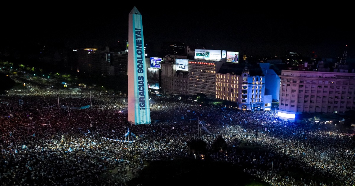 অত রাতেও বিমানবন্দরের বাইরে থিকথিকে ভিড়। ৩৬ বছরের বিশ্বকাপ-খরা কাটানোর আনন্দে সেই রবিবার থেকেই তো আর্জেন্টাইনরা রাত জাগছেন! অধীর আগ্রহে অপেক্ষা করছেন বিশ্বচ্যাম্পিয়নদের বরণ করার জন্য। বিমানবন্দরে মেসিদের জন্য অপেক্ষা করছিল হুডখোলা বাস। যার গায়ে বড় বড় হরফে লেখা ‘বিশ্বচ্যাম্পিয়ন’। সেই বাস বাইরে বেরোতেই আবেগের গণবিস্ফোরণ! ‘ভামোস আর্জেন্টিনা’ জয়ধ্বনিতে যেন কেঁপে উঠল গোটা শহর! জনজোয়ারে ভেসে বাস ধীর গতিতে এগিয়ে চলল শহরের প্রাণকেন্দ্র ওবেলিক্স স্কোয়ারের দিকে। আর্জেন্টিনা ফুটবল ফেডারেশন আগেই ট্যুইট করে জানিয়েছিল, ‘‘মঙ্গলবার বুয়েনস আইরেসের ওবেলিক্সে গিয়ে উৎসব করবে বিশ্বকাপজয়ীরা। সেখানে উপস্থিত থাকবেন সমর্থকরাও।’’ রাস্তার দু’পাশে তাই যেদিকে চোখ যায় কালো মাথার ঢল। স্থানীয় সংবাদমাধ্যমের পরিসংখ্যান অনুযায়ী, সংখ্যাটা প্রায় দু’লক্ষ ছুঁইছুঁই (এক লক্ষ ৭৬ হাজার)!