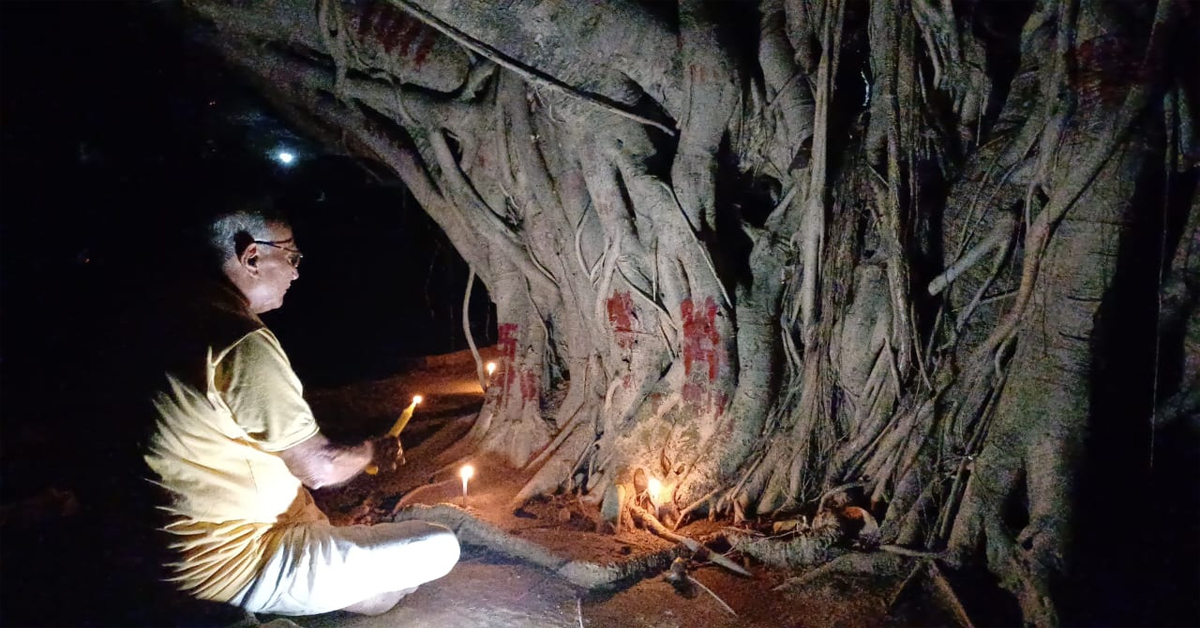 সংবাদদাতা, আসানসোল : ৭১ বছরেরও বেশি সময় ধরে পিয়ালবোড়োর বাসিন্দারা বিশ্বাস করেন এক রাতের জন্য ভূতেরা মুক্তি পায় পিয়ালবোড়োর শ্মশানঘাটে। ভূত চতুর্দশীর রাতে ঘটে মুক্তিলাভ, পরের দিনই ফের মন্ত্রতন্ত্রে গাছে বাঁধা পড়ে ভূতেরা। আসানসোলের মহীশিলা গ্রামের ১ নম্বর কলোনির শ্মশানঘাটে ভূতচতুর্দশীর দিন থেকে সাজ-সাজ রব। এই গাছেই ভূতদের বেঁধে দিয়েছিলেন সাধক বামাক্ষ্যাপার প্রধান শিষ্য বনমালী ভট্টাচার্য। প্রায় ৭১ বছর আগের সে কাহিনি আজ মিথে পরিণত। মানুষের বিশ্বাস গাছে বাঁধা-পড়া তেনারা আজও রয়েছেন স্বমহিমায়। আসানসোলের রায় পরিবারের জমিদার তান্ত্রিক বনমালী ভট্টাচার্যকে আশ্রম গড়তে জমি দেন। পিয়ালবোড়োর শ্মশান-সংলগ্ন স্থানে তিনি সাধনক্ষেত্র গড়েন। কিন্তু আশ্রম করতে গিয়ে বিপত্তি। ওখানে নাকি ভূতের এমনই উপদ্রব ছিল যে গ্রামের কেউ মারা গেলে রাতে শ্মশানে নিয়ে যেতেও ভয় পেতেন। এখন শ্মশান নেই। আছে আশ্রমের পঞ্চমুণ্ডির আসন। বনমালী ভট্টাচার্যের পর পুজোর দায়িত্ব নেন শম্ভুনাথ ভট্টাচার্য। তার পর বিশ্বনাথ ভট্টাচার্য কার্তিক অমাবস্যার আগে ভূত চতুর্দশীতে কালীপুজো করেন। শিবাভোগ ও ভৈরব ভোগ দান করা হয়। ভোগের উপাচার মদ আর মাংস। কালীপুজোর (kali puja) পরে ভূতেদের বেঁধে দেওয়া হয়। এই রীতি আজও চলে আসছে পরম্পরা মেনে।