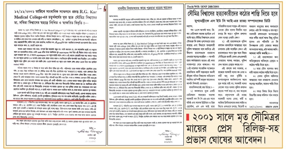 এমনকী পুত্রহারা হতভাগিনী মাকে এই দু’জন কীভাবে আরজি করের তৎকালীন অধ্যক্ষের সঙ্গে দেখা করতে বাধা দিয়েছিলেন, রয়েছে সেই অভিযোগও। শুধু তাই নয়, সৌমিত্রর মা সাহায্য চেয়ে চিঠি দিয়েছিলেন তৎকালীন বাম বিধায়কদেরও। মায়ের অভিযোগ, তাঁর ছেলে আত্মহত্যা করেননি। তাঁকে মেরে ফেলা হয়েছে। কিন্তু একথা কিছুতেই তিনি তৎকালীন প্রশাসনের শীর্ষ স্তরে পৌঁছতে পারেননি। বাধা দিয়েছিলেন সেই সময়কার এসএফআই নেতা সুবর্ণ ও অরুণাভ। এমনকী সেসময় সুবিচার চেয়ে মুখ্যমন্ত্রী, পুলিশ কমিশনার, স্বাস্থ্যমন্ত্রীকে চিঠি লিখেও কোনও সাড়া পাননি। চিৎপুর থানায় ছেলের মৃত্যুর অভিযোগ জানানো হলেও পুলিশ কিছুই করেনি। এখানেই শেষ নয়, সৌমিত্রর মা ছেলের পোস্টমর্টেম রিপোর্টটুকুও পাননি। আক্ষেপ জানিয়ে তিনি লিখেছেন, মুখ্যমন্ত্রীর সঙ্গে দেখা করতে চেয়ে তাঁর আবেদন বারবার হারিয়ে গিয়েছে দফতর থেকে।