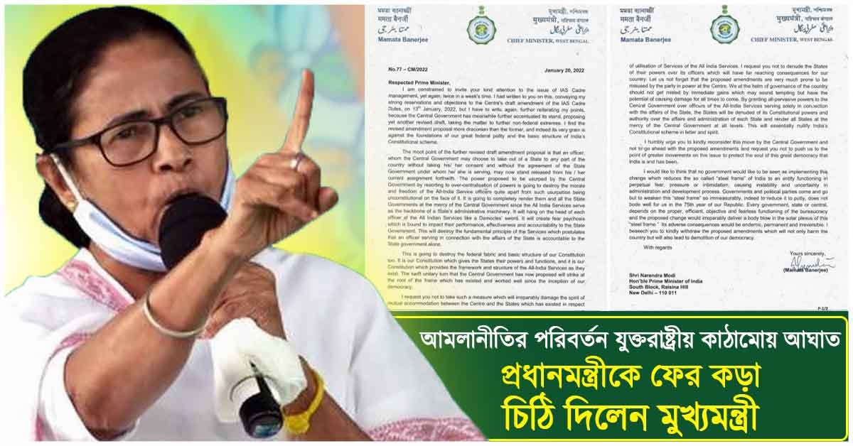 বিষয় দেশের আইএএস ক্যাডারদের কেন্দ্রের নিয়ন্ত্রনে আনার জন্য আইন পরিবর্তন। আর সে নিয়ে এবার প্রধানমন্ত্রীকে আরও কড়া ভাষায় চিঠি মুখ্যমন্ত্রী মমতা বন্দ্যোপাধ্যায়ের (Mamata Banerjee)। একই বিষয় নিয়ে এক সপ্তাহে দু’দুবার চিঠি। নিঃসন্দেহে নজিরবিহীন। আর এই বিষয়টি নিয়ে মুখ্যমন্ত্রী তাঁর উদ্বেগ ঢেকে না রেখে স্পষ্ট ভাষায় জানিয়েছেন, এতে দেশের সংবিধানের ‘লৌহকঠিন কাঠামো’ আঘাতপ্রাপ্ত হবে। প্রশাসনের মধ্যে ভয় আর চাপ তৈরি হবে। উন্নয়নে অনিশ্চয়তা তৈরি হবে। স্বাধীনতার ৭৫ পূর্তিতে তা মোটেই আপামর ভারতবাসীর কাছে কাম্য হতে পারে না। কেন্দ্রের সিদ্ধান্ত যুক্তরাষ্ট্রীয় কাঠামোর উপর বড় আঘাত হতে চলেছে।